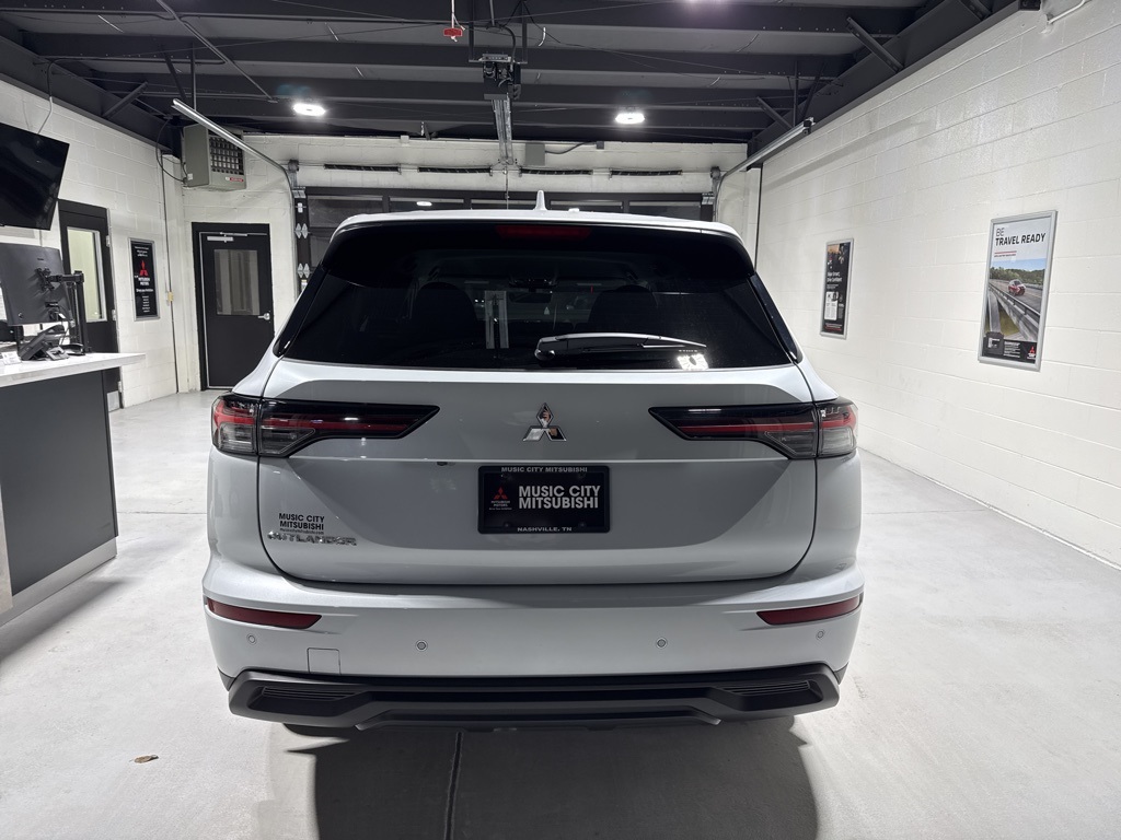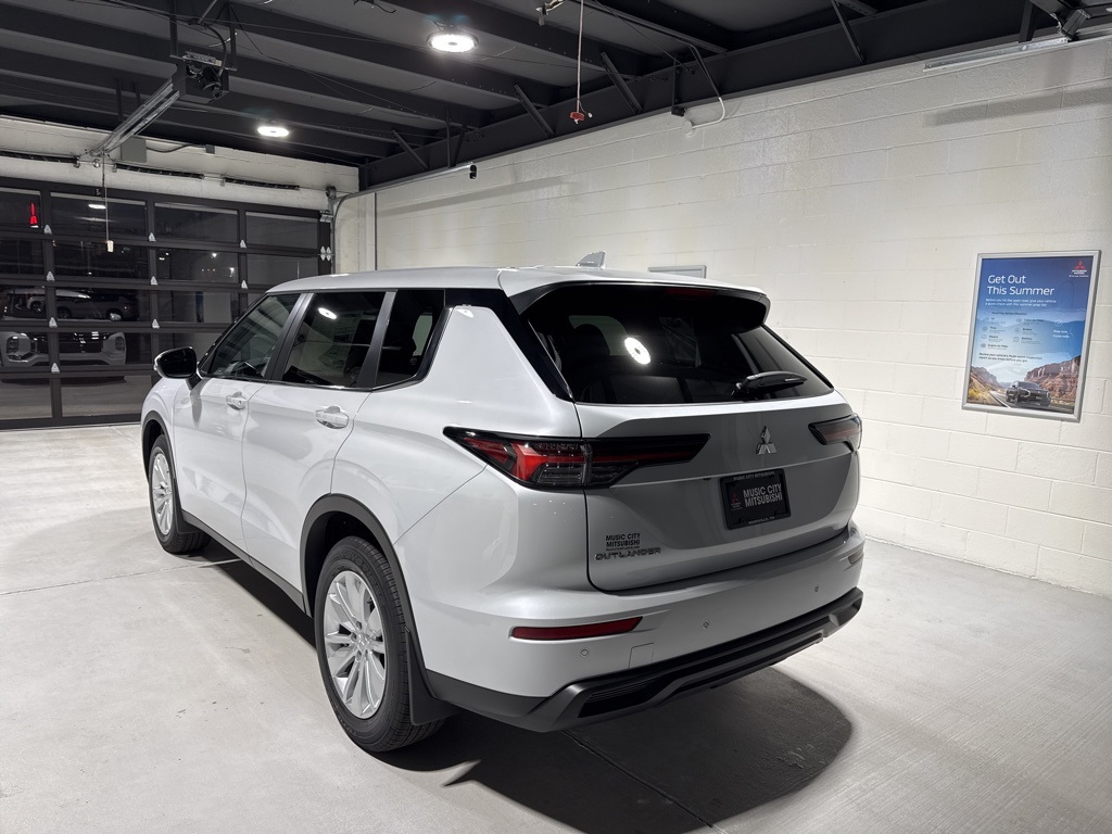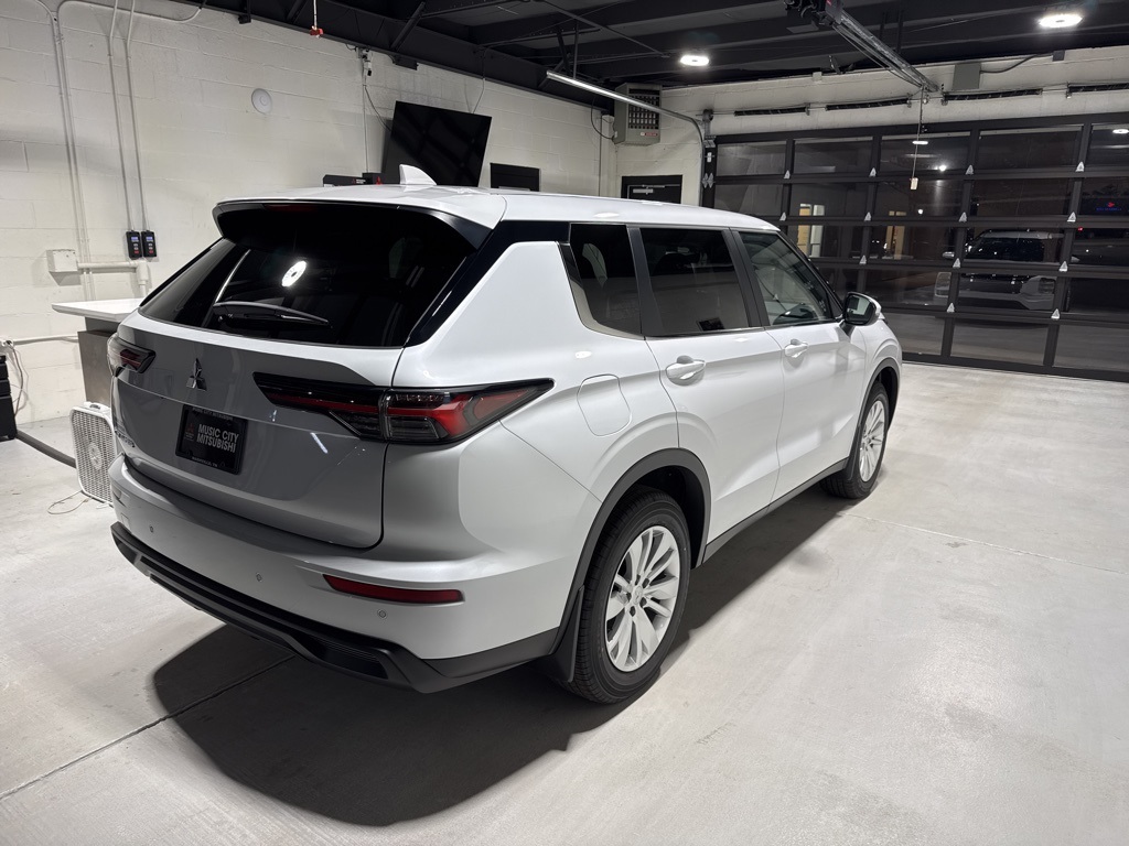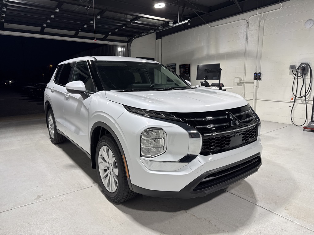 White 2025 Mitsubishi Outlander ES FWD CVT 2.5L I4 DOHC 16V LEV3-SULEV30 181hp 18" Alloy Wheels, 3rd row seats: split-bench, 4-Wheel Disc Brakes, 8 Speakers, ABS brakes, Air Conditioning, Alloy wheels, AM/FM radio: SiriusXM, Android Auto & Apple CarPlay, Auto High-beam Headlights, Auto-dimming Rear-View mirror, Automatic temperature control, Blind Spot Warning, Brake assist, Bumpers: body-color, Cloth Fabric Seating Surfaces, Driver door bin, Driver vanity mirror, Dual front impact airbags, Dual front side impact airbags, Electronic Stability Control, Emergency communication system: Mitsubishi Connect w/ 24-month trial, Exterior Parking Camera Rear, Four wheel independent suspension, Front anti-roll bar, Front Bucket Seats, Front Center Armrest w/Storage, Front dual zone A/C, Front reading lights, Fully automatic headlights, Illuminated entry, Knee airbag, Low tire pressure warning, Navigation System, Occupant sensing airbag, Outside temperature display, Overhead airbag, Overhead console, Panic alarm, Passenger door bin, Passenger vanity mirror, Power door mirrors, Power steering, Power windows, Radio data system, Radio: AM/FM 12.3" Navigation w/Smartphone-Link, Rear anti-roll bar, Rear Parking Sensors, Rear seat center armrest, Rear side impact airbag, Rear window defroster, Rear window wiper, Reclining 3rd row seat, Remote keyless entry, Security system, Speed control, Speed-Sensitive Wipers, Split folding rear seat, Spoiler, Steering wheel mounted audio controls, Tachometer, Telescoping steering wheel, Tilt steering wheel, Traction control, Trip computer, Turn signal indicator mirrors, Variably intermittent wipers.