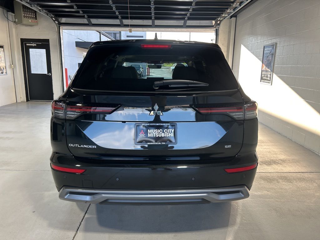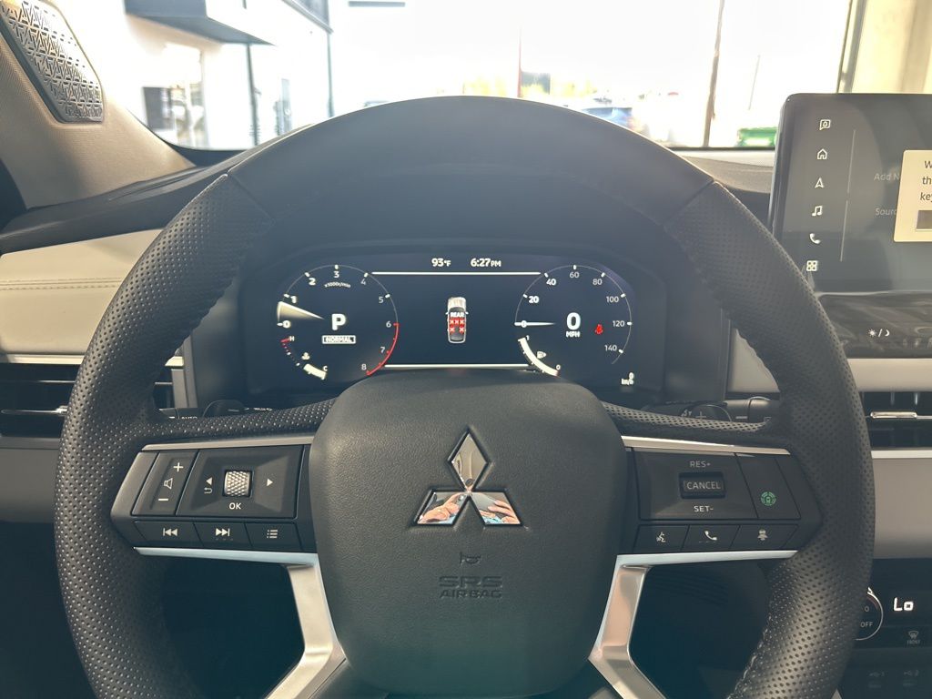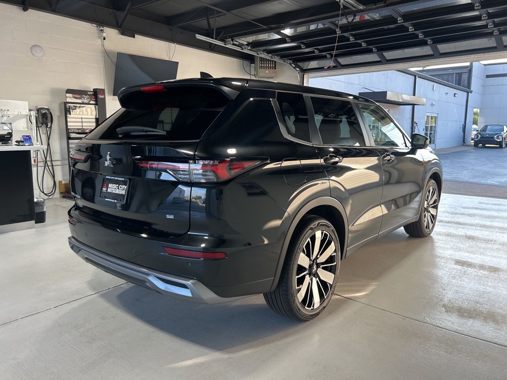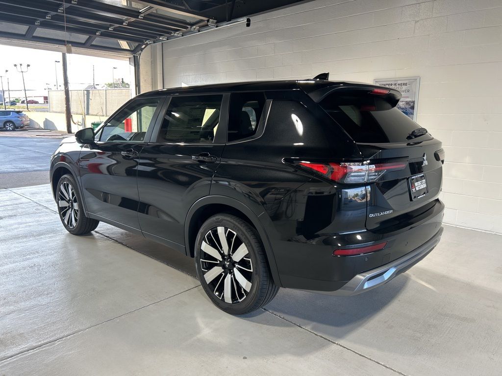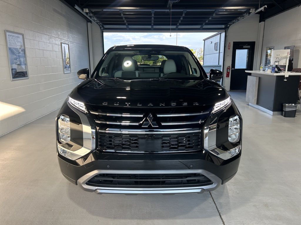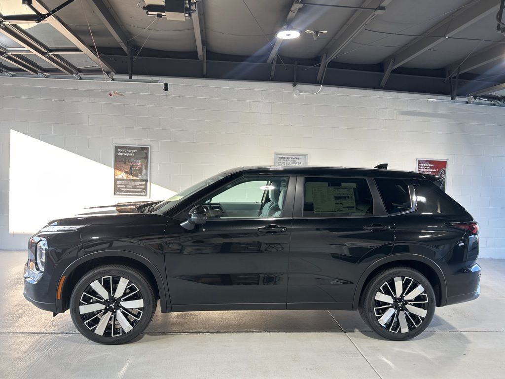 Black 2025 Mitsubishi Outlander SE FWD CVT 2.5L I4 DOHC 16V LEV3-SULEV30 181hp 3rd row seats: split-bench, 4-Wheel Disc Brakes, 8 Speakers, ABS brakes, Air Conditioning, Alloy wheels, AM/FM radio: SiriusXM, Android Auto & Apple CarPlay, Auto High-beam Headlights, Auto-dimming Rear-View mirror, Automatic temperature control, Brake assist, Bumpers: body-color, Driver door bin, Driver vanity mirror, Dual front impact airbags, Dual front side impact airbags, Electronic Stability Control, Emergency communication system: Mitsubishi Connect w/ 24-month trial, Exterior Parking Camera Rear, Four wheel independent suspension, Front anti-roll bar, Front Bucket Seats, Front Center Armrest w/Storage, Front dual zone A/C, Front fog lights, Front reading lights, Fully automatic headlights, Garage door transmitter: HomeLink, Heated door mirrors, Heated Front Bucket Seats, Heated front seats, Illuminated entry, Knee airbag, Leather Shift Knob, Leather steering wheel, Low tire pressure warning, Navigation System, Occupant sensing airbag, Outside temperature display, Overhead airbag, Overhead console, Panic alarm, Passenger door bin, Passenger vanity mirror, Power door mirrors, Power driver seat, Power Liftgate, Power steering, Power windows, Radio data system, Radio: AM/FM 12.3" Navigation w/Smartphone-Link, Rain sensing wipers, Rear anti-roll bar, Rear seat center armrest, Rear side impact airbag, Rear window defroster, Rear window wiper, Reclining 3rd row seat, Remote keyless entry, Security system, Speed control, Speed-Sensitive Wipers, Split folding rear seat, Spoiler, Steering wheel mounted audio controls, Synthetic Leather Seating Surfaces, Tachometer, Telescoping steering wheel, Tilt steering wheel, Traction control, Trip computer, Turn signal indicator mirrors, Variably intermittent wipers, Wheels: 20" Two-Tone Alloy.