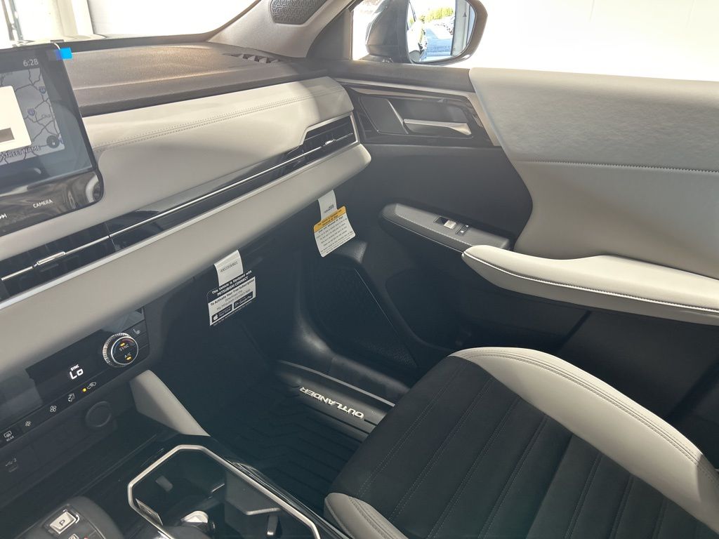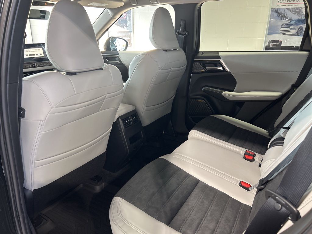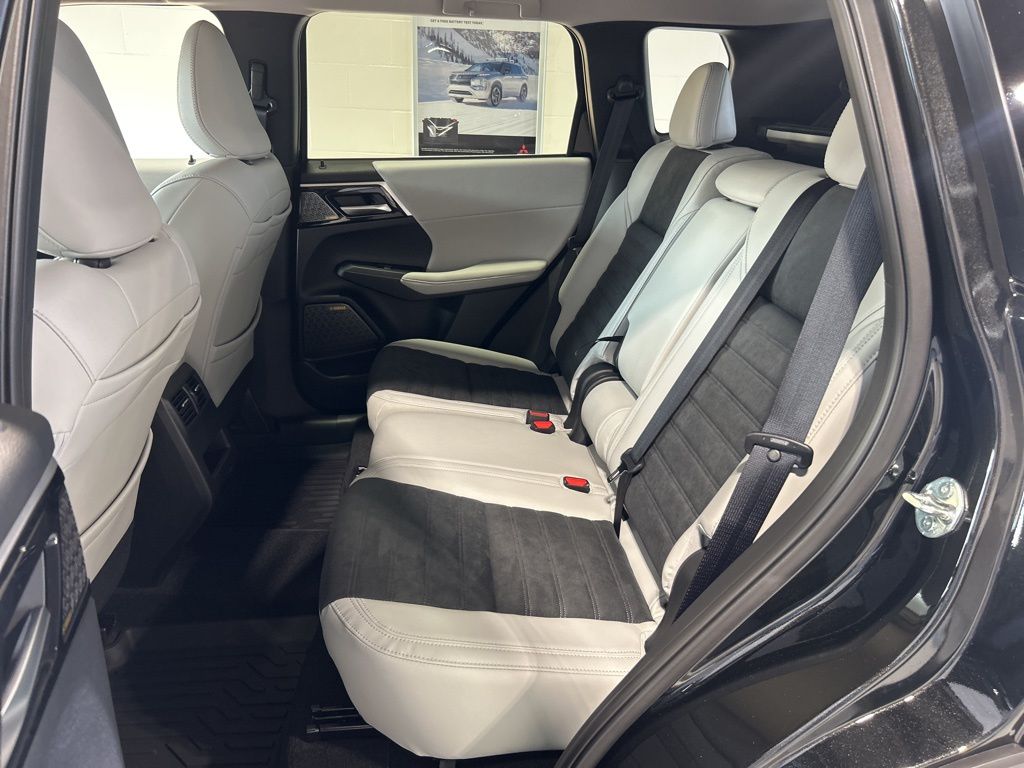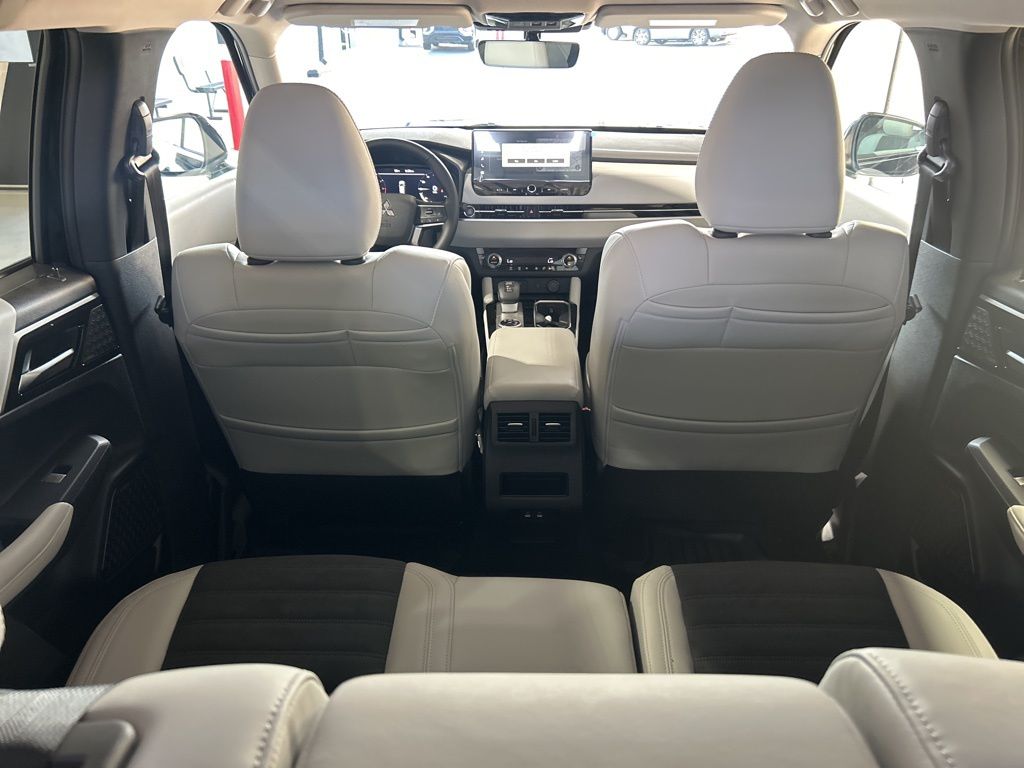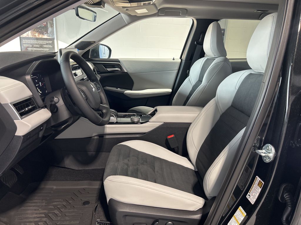 Black 2025 Mitsubishi Outlander SE FWD CVT 2.5L I4 DOHC 16V LEV3-SULEV30 181hp 3rd row seats: split-bench, 4-Wheel Disc Brakes, 8 Speakers, ABS brakes, Air Conditioning, Alloy wheels, AM/FM radio: SiriusXM, Android Auto & Apple CarPlay, Auto High-beam Headlights, Auto-dimming Rear-View mirror, Automatic temperature control, Brake assist, Bumpers: body-color, Driver door bin, Driver vanity mirror, Dual front impact airbags, Dual front side impact airbags, Electronic Stability Control, Emergency communication system: Mitsubishi Connect w/ 24-month trial, Exterior Parking Camera Rear, Four wheel independent suspension, Front anti-roll bar, Front Bucket Seats, Front Center Armrest w/Storage, Front dual zone A/C, Front fog lights, Front reading lights, Fully automatic headlights, Garage door transmitter: HomeLink, Heated door mirrors, Heated Front Bucket Seats, Heated front seats, Illuminated entry, Knee airbag, Leather Shift Knob, Leather steering wheel, Low tire pressure warning, Navigation System, Occupant sensing airbag, Outside temperature display, Overhead airbag, Overhead console, Panic alarm, Passenger door bin, Passenger vanity mirror, Power door mirrors, Power driver seat, Power Liftgate, Power steering, Power windows, Radio data system, Radio: AM/FM 12.3" Navigation w/Smartphone-Link, Rain sensing wipers, Rear anti-roll bar, Rear seat center armrest, Rear side impact airbag, Rear window defroster, Rear window wiper, Reclining 3rd row seat, Remote keyless entry, Security system, Speed control, Speed-Sensitive Wipers, Split folding rear seat, Spoiler, Steering wheel mounted audio controls, Synthetic Leather Seating Surfaces, Tachometer, Telescoping steering wheel, Tilt steering wheel, Traction control, Trip computer, Turn signal indicator mirrors, Variably intermittent wipers, Wheels: 20" Two-Tone Alloy.