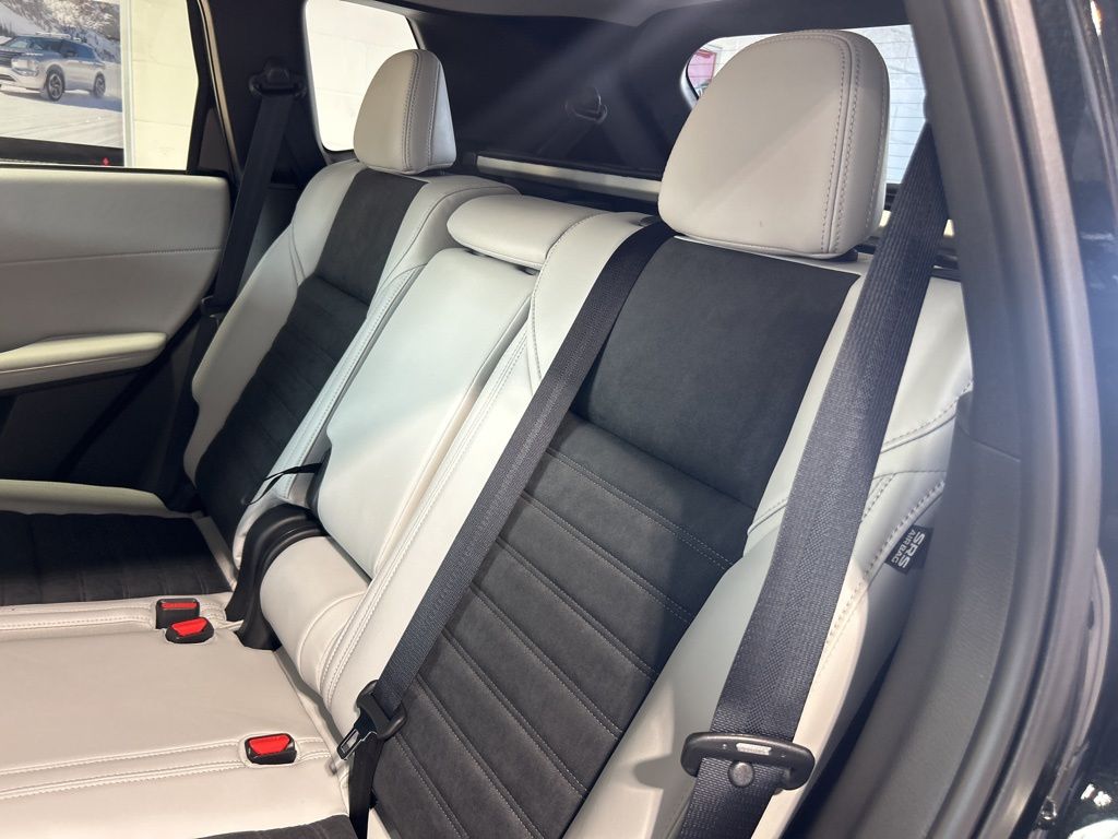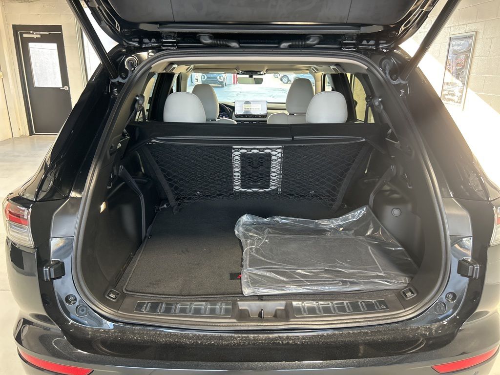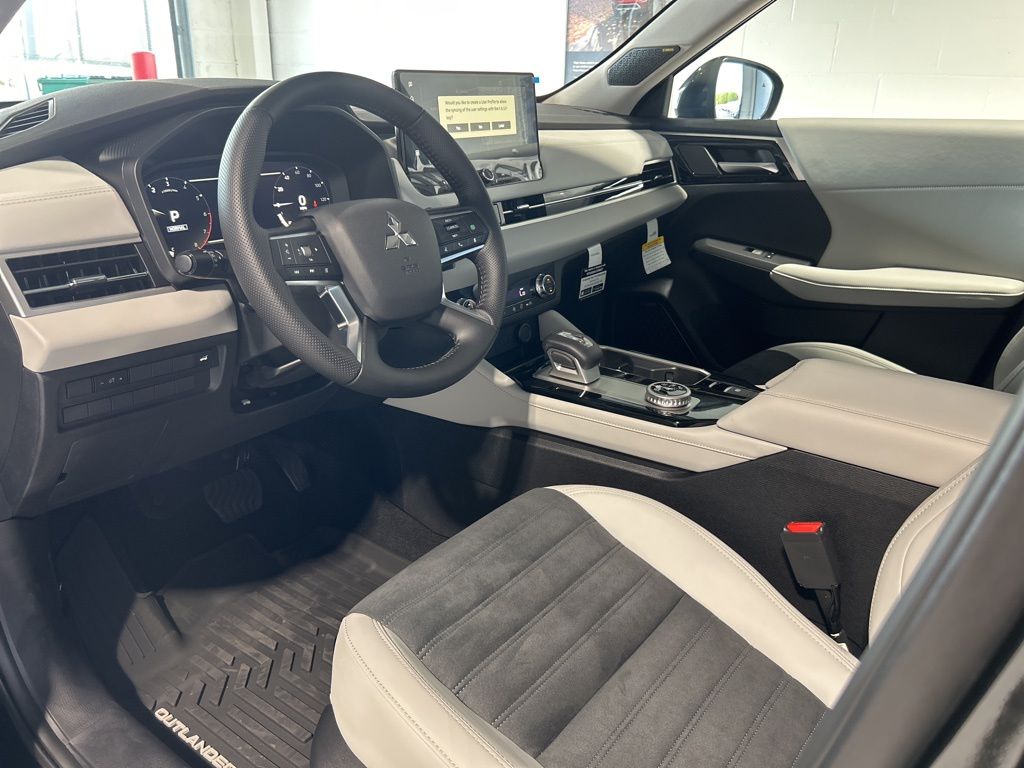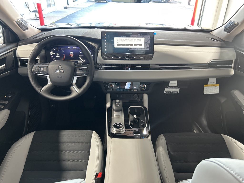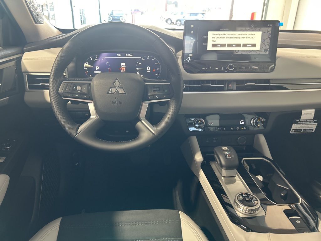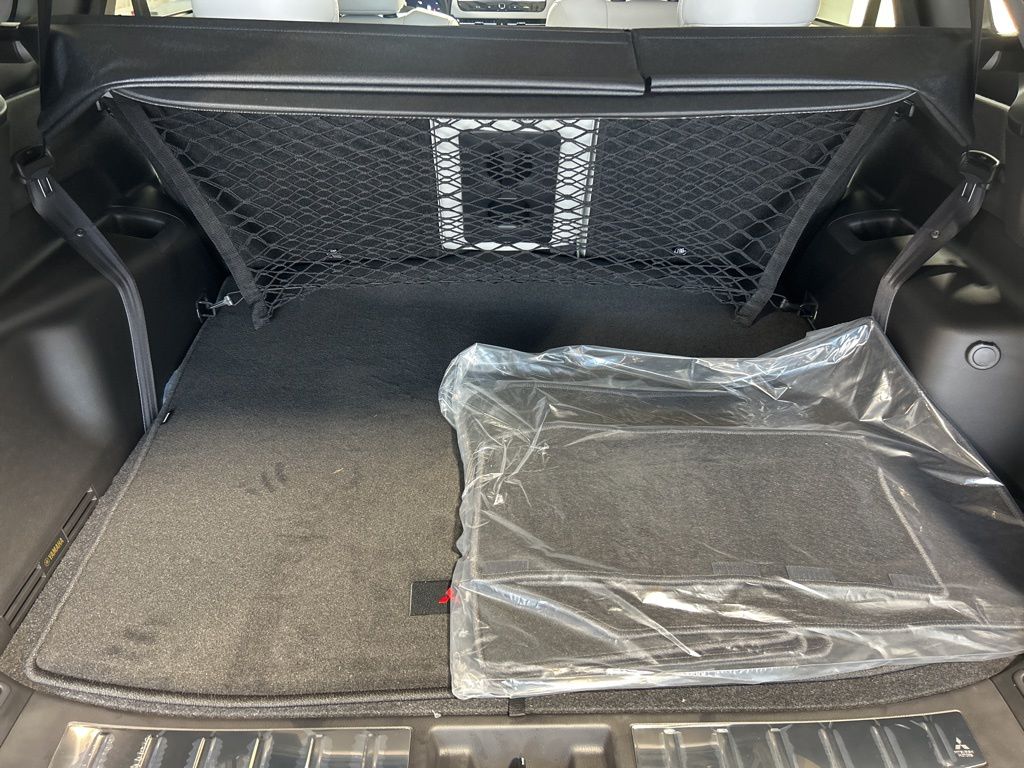 Black 2025 Mitsubishi Outlander SE FWD CVT 2.5L I4 DOHC 16V LEV3-SULEV30 181hp 3rd row seats: split-bench, 4-Wheel Disc Brakes, 8 Speakers, ABS brakes, Air Conditioning, Alloy wheels, AM/FM radio: SiriusXM, Android Auto & Apple CarPlay, Auto High-beam Headlights, Auto-dimming Rear-View mirror, Automatic temperature control, Brake assist, Bumpers: body-color, Driver door bin, Driver vanity mirror, Dual front impact airbags, Dual front side impact airbags, Electronic Stability Control, Emergency communication system: Mitsubishi Connect w/ 24-month trial, Exterior Parking Camera Rear, Four wheel independent suspension, Front anti-roll bar, Front Bucket Seats, Front Center Armrest w/Storage, Front dual zone A/C, Front fog lights, Front reading lights, Fully automatic headlights, Garage door transmitter: HomeLink, Heated door mirrors, Heated Front Bucket Seats, Heated front seats, Illuminated entry, Knee airbag, Leather Shift Knob, Leather steering wheel, Low tire pressure warning, Navigation System, Occupant sensing airbag, Outside temperature display, Overhead airbag, Overhead console, Panic alarm, Passenger door bin, Passenger vanity mirror, Power door mirrors, Power driver seat, Power Liftgate, Power steering, Power windows, Radio data system, Radio: AM/FM 12.3" Navigation w/Smartphone-Link, Rain sensing wipers, Rear anti-roll bar, Rear seat center armrest, Rear side impact airbag, Rear window defroster, Rear window wiper, Reclining 3rd row seat, Remote keyless entry, Security system, Speed control, Speed-Sensitive Wipers, Split folding rear seat, Spoiler, Steering wheel mounted audio controls, Synthetic Leather Seating Surfaces, Tachometer, Telescoping steering wheel, Tilt steering wheel, Traction control, Trip computer, Turn signal indicator mirrors, Variably intermittent wipers, Wheels: 20" Two-Tone Alloy.
