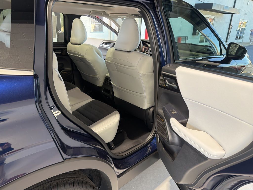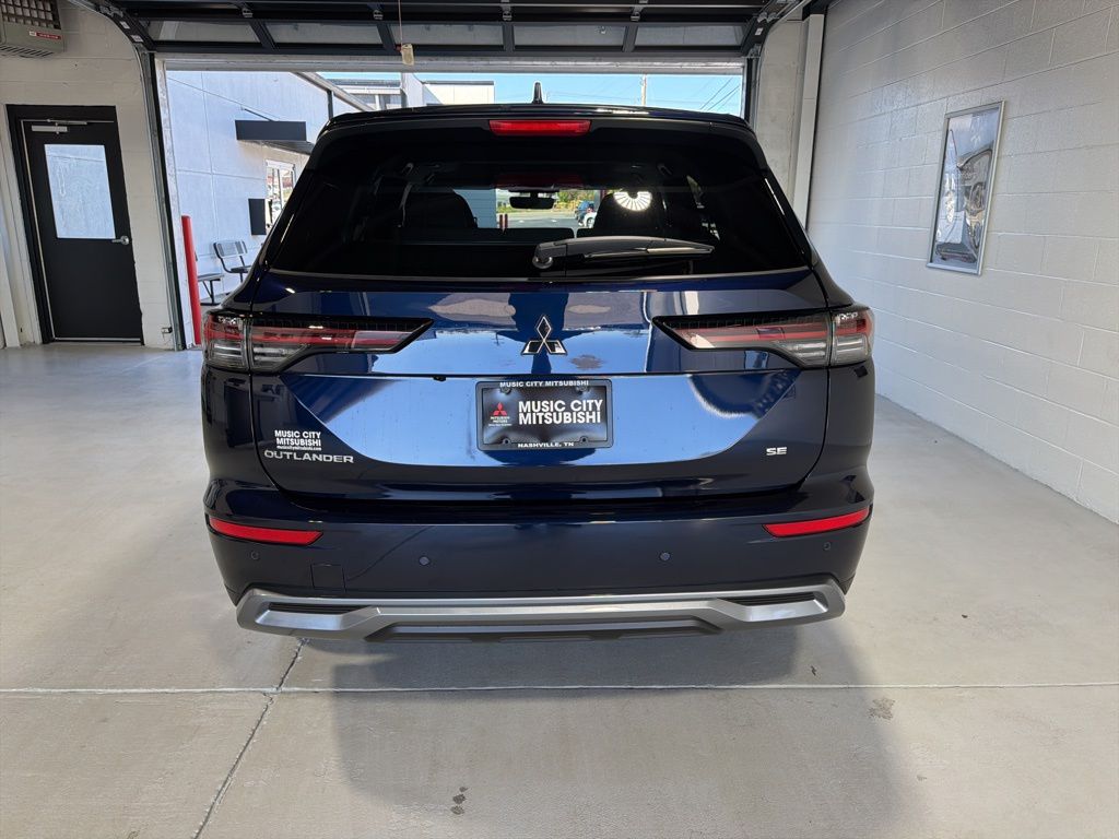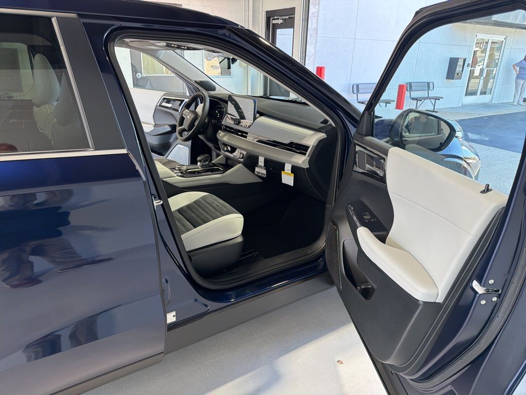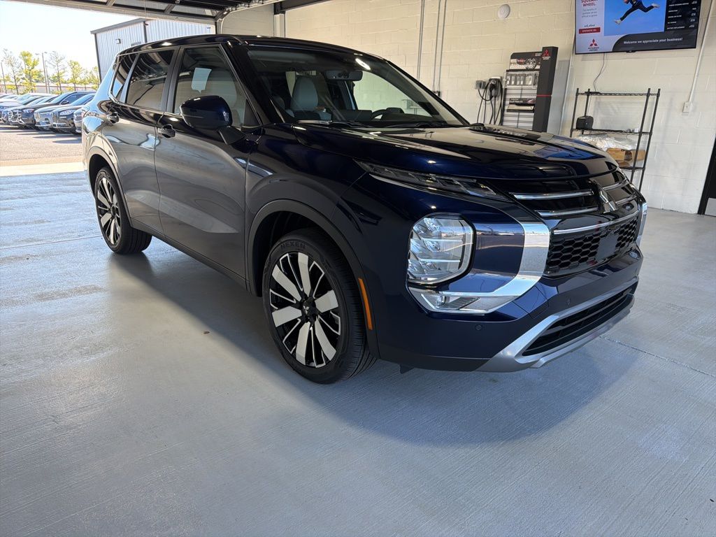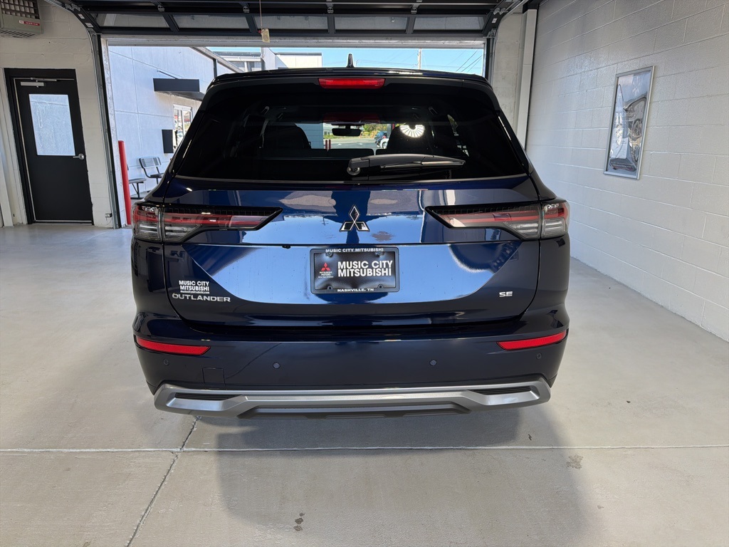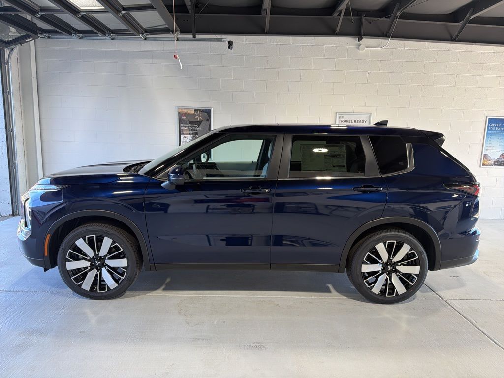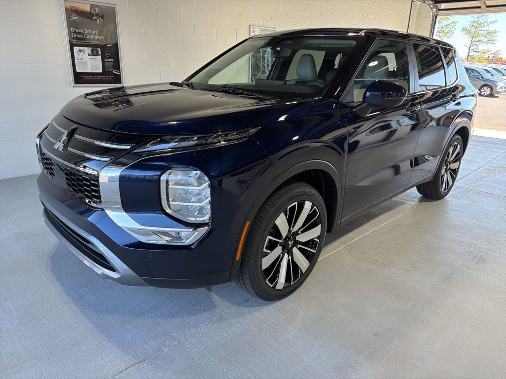 Blue 2025 Mitsubishi Outlander SE FWD CVT 2.5L I4 DOHC 16V LEV3-SULEV30 181hp 3rd row seats: split-bench, 4-Wheel Disc Brakes, 8 Speakers, ABS brakes, Air Conditioning, Alloy wheels, AM/FM radio: SiriusXM, Android Auto & Apple CarPlay, Auto High-beam Headlights, Auto-dimming Rear-View mirror, Automatic temperature control, Brake assist, Bumpers: body-color, Driver door bin, Driver vanity mirror, Dual front impact airbags, Dual front side impact airbags, Electronic Stability Control, Emergency communication system: Mitsubishi Connect w/ 24-month trial, Exterior Parking Camera Rear, Four wheel independent suspension, Front anti-roll bar, Front Bucket Seats, Front Center Armrest w/Storage, Front dual zone A/C, Front fog lights, Front reading lights, Fully automatic headlights, Garage door transmitter: HomeLink, Heated door mirrors, Heated Front Bucket Seats, Heated front seats, Illuminated entry, Knee airbag, Leather Shift Knob, Leather steering wheel, Low tire pressure warning, Navigation System, Occupant sensing airbag, Outside temperature display, Overhead airbag, Overhead console, Panic alarm, Passenger door bin, Passenger vanity mirror, Power door mirrors, Power driver seat, Power Liftgate, Power steering, Power windows, Radio data system, Radio: AM/FM 12.3" Navigation w/Smartphone-Link, Rain sensing wipers, Rear anti-roll bar, Rear seat center armrest, Rear side impact airbag, Rear window defroster, Rear window wiper, Reclining 3rd row seat, Remote keyless entry, Security system, Speed control, Speed-Sensitive Wipers, Split folding rear seat, Spoiler, Steering wheel mounted audio controls, Synthetic Leather Seating Surfaces, Tachometer, Telescoping steering wheel, Tilt steering wheel, Traction control, Trip computer, Turn signal indicator mirrors, Variably intermittent wipers, Wheels: 20" Two-Tone Alloy.