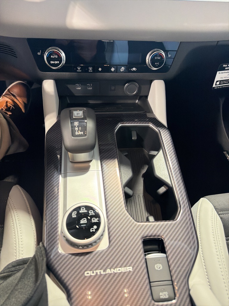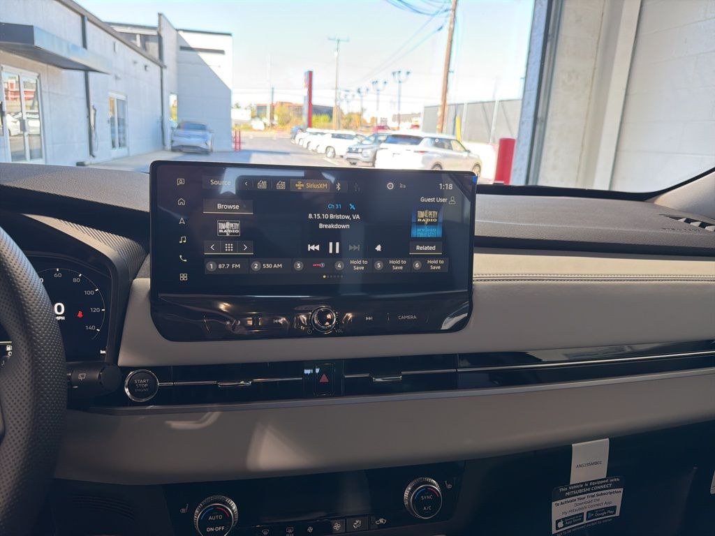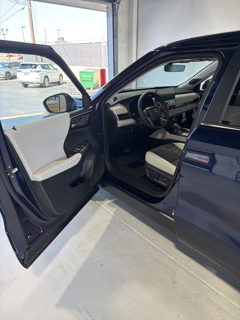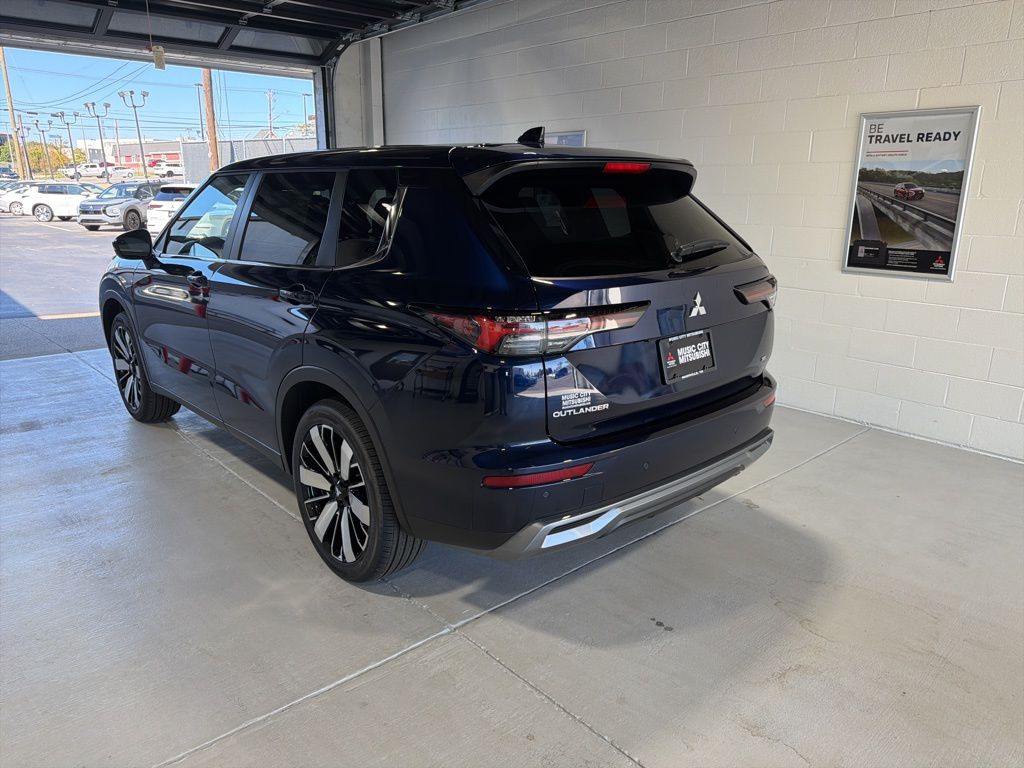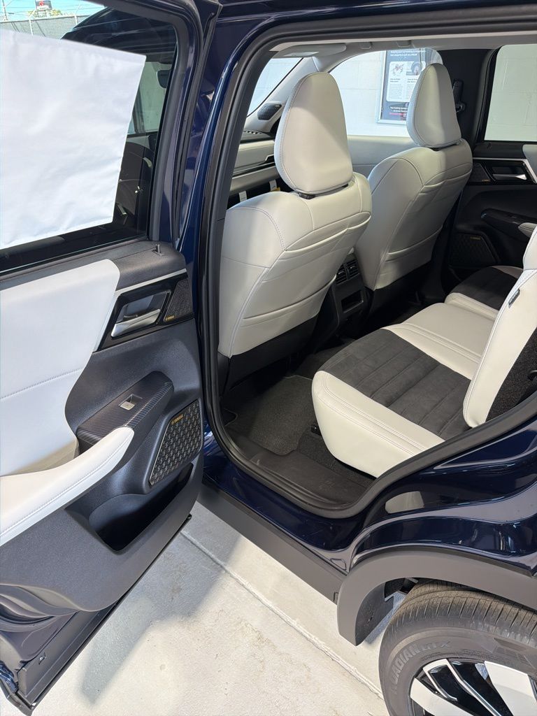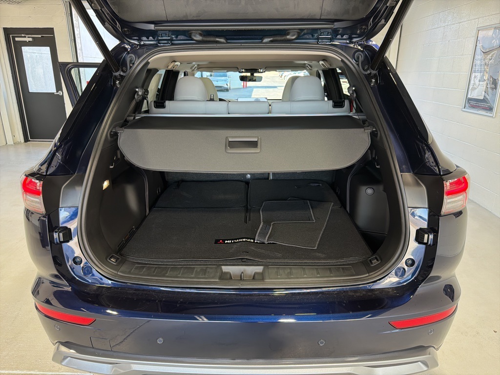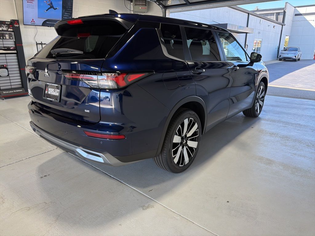 Blue 2025 Mitsubishi Outlander SE FWD CVT 2.5L I4 DOHC 16V LEV3-SULEV30 181hp 3rd row seats: split-bench, 4-Wheel Disc Brakes, 8 Speakers, ABS brakes, Air Conditioning, Alloy wheels, AM/FM radio: SiriusXM, Android Auto & Apple CarPlay, Auto High-beam Headlights, Auto-dimming Rear-View mirror, Automatic temperature control, Brake assist, Bumpers: body-color, Driver door bin, Driver vanity mirror, Dual front impact airbags, Dual front side impact airbags, Electronic Stability Control, Emergency communication system: Mitsubishi Connect w/ 24-month trial, Exterior Parking Camera Rear, Four wheel independent suspension, Front anti-roll bar, Front Bucket Seats, Front Center Armrest w/Storage, Front dual zone A/C, Front fog lights, Front reading lights, Fully automatic headlights, Garage door transmitter: HomeLink, Heated door mirrors, Heated Front Bucket Seats, Heated front seats, Illuminated entry, Knee airbag, Leather Shift Knob, Leather steering wheel, Low tire pressure warning, Navigation System, Occupant sensing airbag, Outside temperature display, Overhead airbag, Overhead console, Panic alarm, Passenger door bin, Passenger vanity mirror, Power door mirrors, Power driver seat, Power Liftgate, Power steering, Power windows, Radio data system, Radio: AM/FM 12.3" Navigation w/Smartphone-Link, Rain sensing wipers, Rear anti-roll bar, Rear seat center armrest, Rear side impact airbag, Rear window defroster, Rear window wiper, Reclining 3rd row seat, Remote keyless entry, Security system, Speed control, Speed-Sensitive Wipers, Split folding rear seat, Spoiler, Steering wheel mounted audio controls, Synthetic Leather Seating Surfaces, Tachometer, Telescoping steering wheel, Tilt steering wheel, Traction control, Trip computer, Turn signal indicator mirrors, Variably intermittent wipers, Wheels: 20" Two-Tone Alloy.