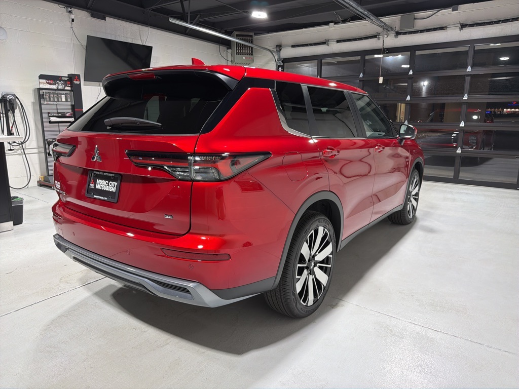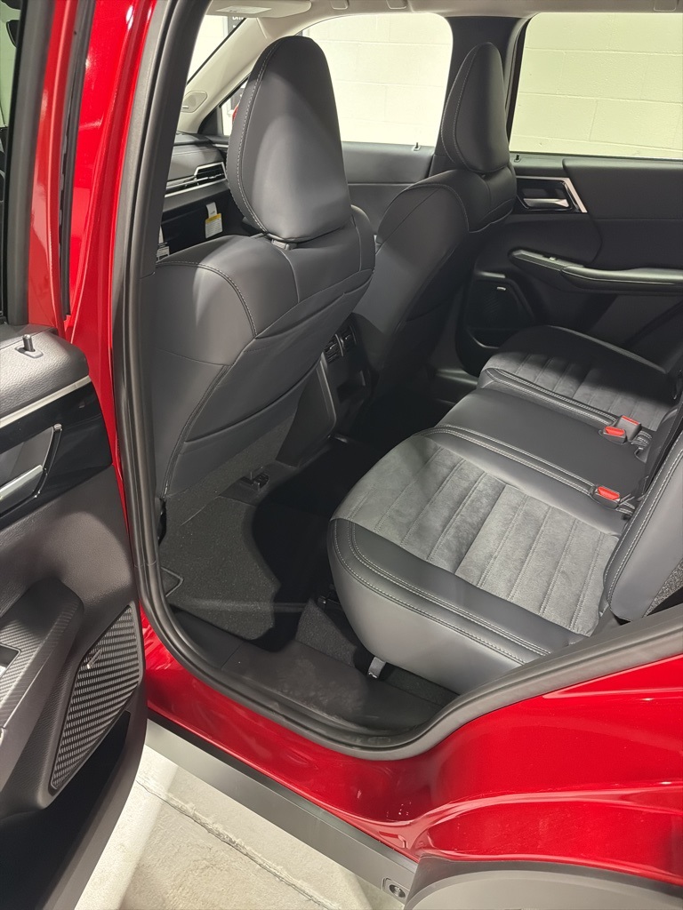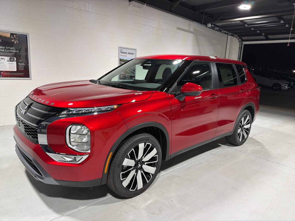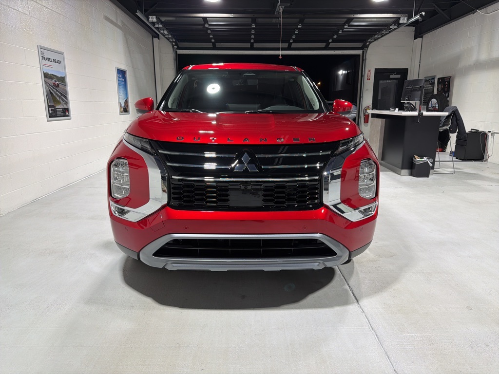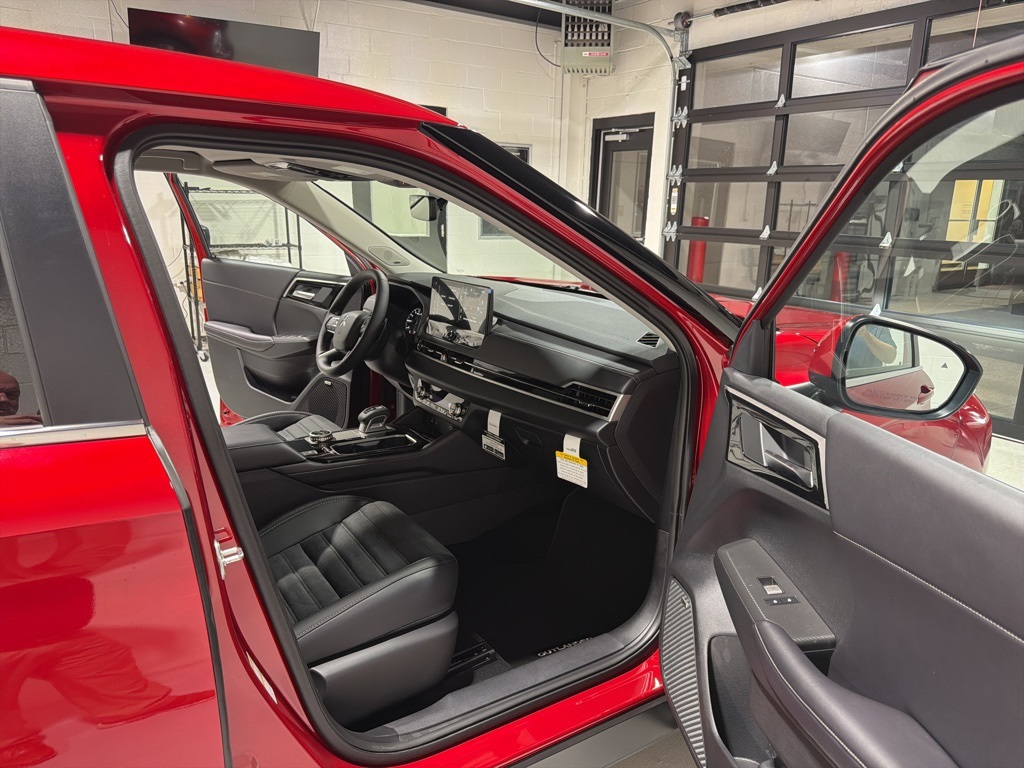 Red 2025 Mitsubishi Outlander SE FWD CVT 2.5L I4 DOHC 16V LEV3-SULEV30 181hp 3rd row seats: split-bench, 4-Wheel Disc Brakes, 8 Speakers, ABS brakes, Air Conditioning, Alloy wheels, AM/FM radio: SiriusXM, Android Auto & Apple CarPlay, Auto High-beam Headlights, Auto-dimming Rear-View mirror, Automatic temperature control, Brake assist, Bumpers: body-color, Driver door bin, Driver vanity mirror, Dual front impact airbags, Dual front side impact airbags, Electronic Stability Control, Emergency communication system: Mitsubishi Connect w/ 24-month trial, Exterior Parking Camera Rear, Four wheel independent suspension, Front anti-roll bar, Front Bucket Seats, Front Center Armrest w/Storage, Front dual zone A/C, Front fog lights, Front reading lights, Fully automatic headlights, Garage door transmitter: HomeLink, Heated door mirrors, Heated Front Bucket Seats, Heated front seats, Illuminated entry, Knee airbag, Leather Shift Knob, Leather steering wheel, Low tire pressure warning, Navigation System, Occupant sensing airbag, Outside temperature display, Overhead airbag, Overhead console, Panic alarm, Passenger door bin, Passenger vanity mirror, Power door mirrors, Power driver seat, Power Liftgate, Power steering, Power windows, Radio data system, Radio: AM/FM 12.3" Navigation w/Smartphone-Link, Rain sensing wipers, Rear anti-roll bar, Rear seat center armrest, Rear side impact airbag, Rear window defroster, Rear window wiper, Reclining 3rd row seat, Remote keyless entry, Security system, Speed control, Speed-Sensitive Wipers, Split folding rear seat, Spoiler, Steering wheel mounted audio controls, Synthetic Leather Seating Surfaces, Tachometer, Telescoping steering wheel, Tilt steering wheel, Traction control, Trip computer, Turn signal indicator mirrors, Variably intermittent wipers, Wheels: 20" Two-Tone Alloy.