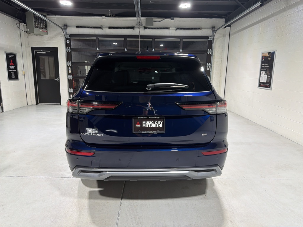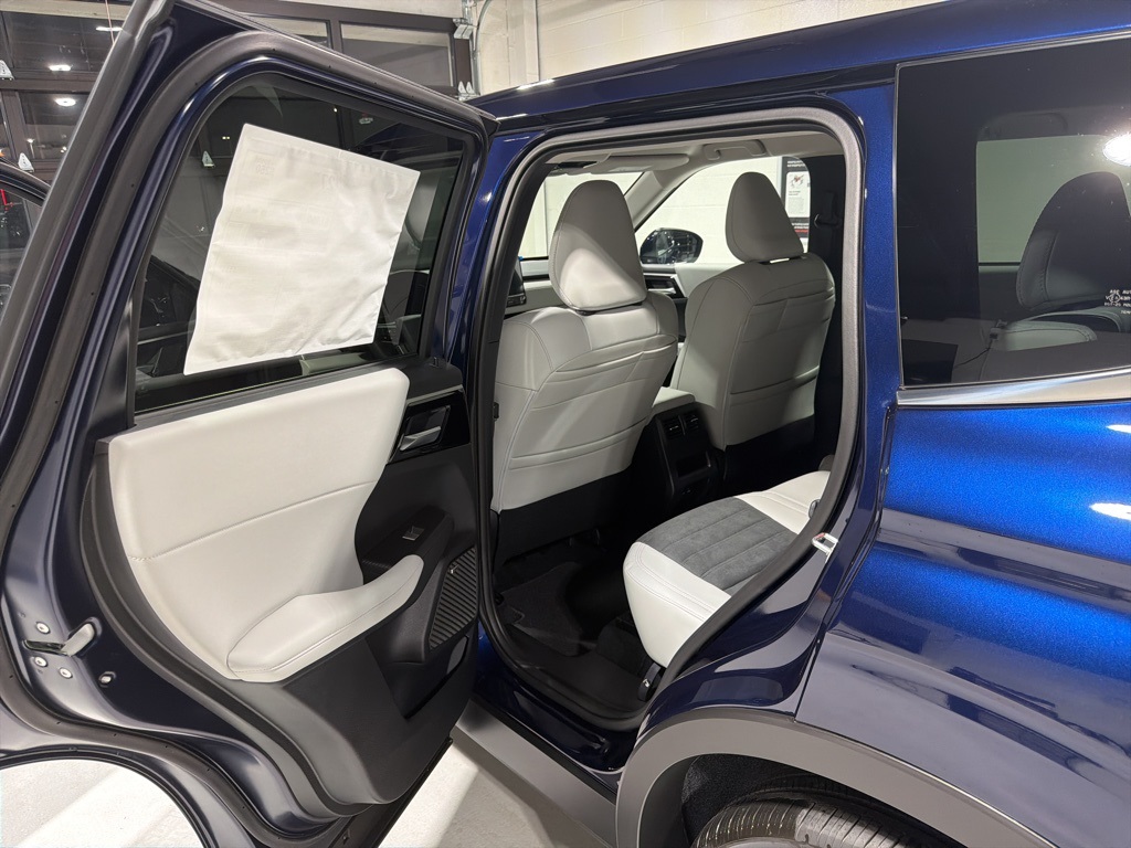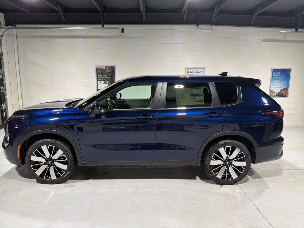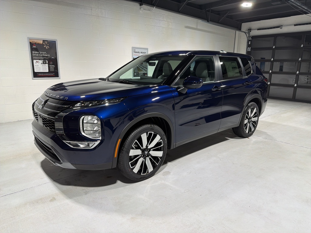 Blue 2025 Mitsubishi Outlander SE FWD CVT 2.5L I4 DOHC 16V LEV3-SULEV30 181hp 3rd row seats: split-bench, 4-Wheel Disc Brakes, 8 Speakers, ABS brakes, Air Conditioning, Alloy wheels, AM/FM radio: SiriusXM, Android Auto & Apple CarPlay, Auto High-beam Headlights, Auto-dimming Rear-View mirror, Automatic temperature control, Brake assist, Bumpers: body-color, Driver door bin, Driver vanity mirror, Dual front impact airbags, Dual front side impact airbags, Electronic Stability Control, Emergency communication system: Mitsubishi Connect w/ 24-month trial, Exterior Parking Camera Rear, Four wheel independent suspension, Front anti-roll bar, Front Bucket Seats, Front Center Armrest w/Storage, Front dual zone A/C, Front fog lights, Front reading lights, Fully automatic headlights, Garage door transmitter: HomeLink, Heated door mirrors, Heated Front Bucket Seats, Heated front seats, Illuminated entry, Knee airbag, Leather Shift Knob, Leather steering wheel, Low tire pressure warning, Navigation System, Occupant sensing airbag, Outside temperature display, Overhead airbag, Overhead console, Panic alarm, Passenger door bin, Passenger vanity mirror, Power door mirrors, Power driver seat, Power Liftgate, Power steering, Power windows, Radio data system, Radio: AM/FM 12.3" Navigation w/Smartphone-Link, Rain sensing wipers, Rear anti-roll bar, Rear seat center armrest, Rear side impact airbag, Rear window defroster, Rear window wiper, Reclining 3rd row seat, Remote keyless entry, Security system, Speed control, Speed-Sensitive Wipers, Split folding rear seat, Spoiler, Steering wheel mounted audio controls, Synthetic Leather Seating Surfaces, Tachometer, Telescoping steering wheel, Tilt steering wheel, Traction control, Trip computer, Turn signal indicator mirrors, Variably intermittent wipers, Wheels: 20" Two-Tone Alloy.