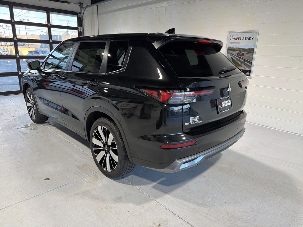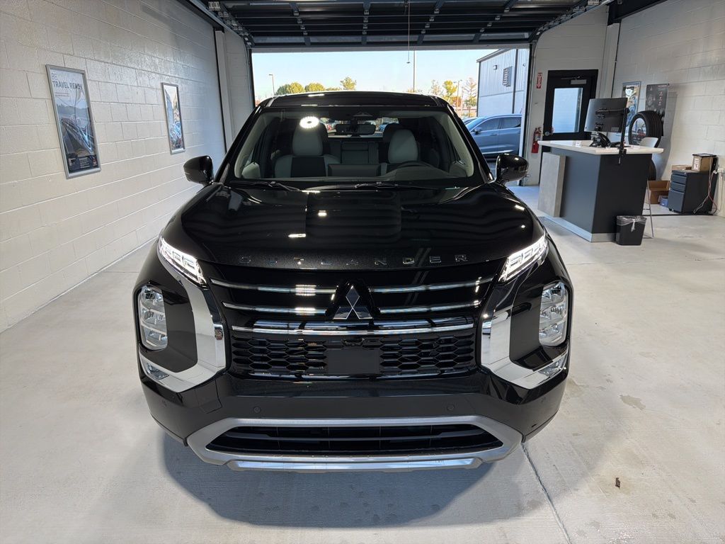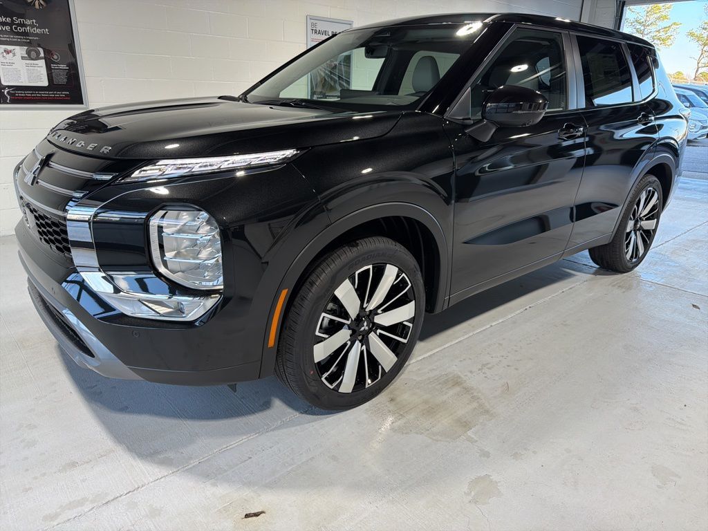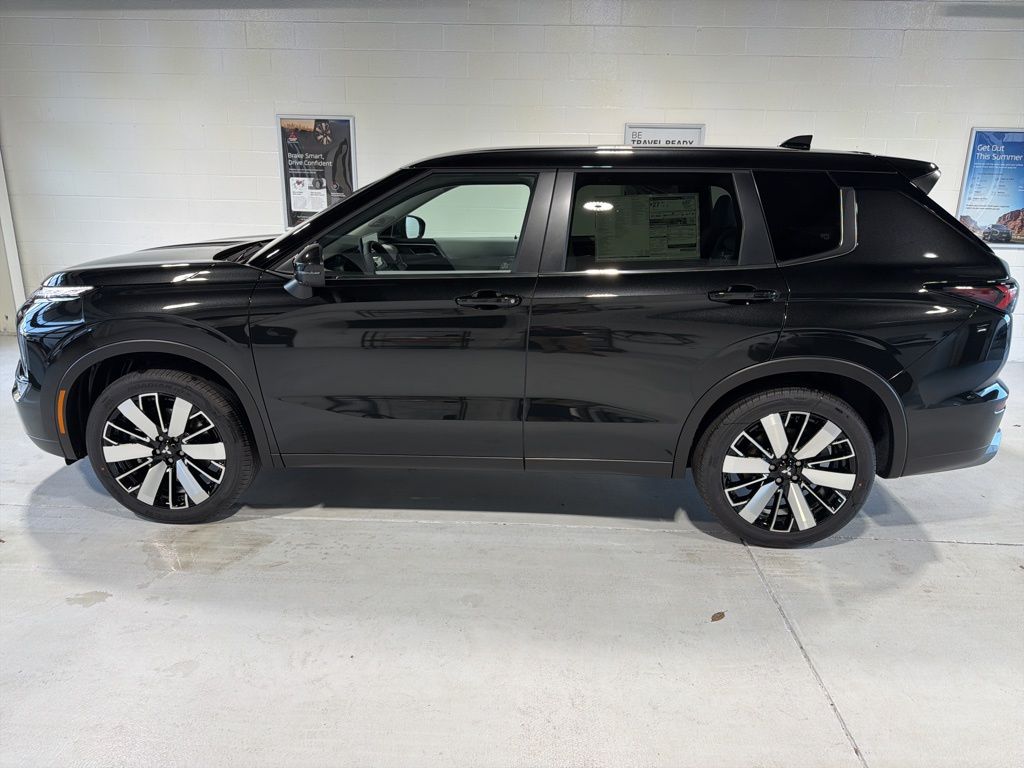 Black 2025 Mitsubishi Outlander SE FWD CVT 2.5L I4 DOHC 16V LEV3-SULEV30 181hp 3rd row seats: split-bench, 4-Wheel Disc Brakes, 8 Speakers, ABS brakes, Air Conditioning, Alloy wheels, AM/FM radio: SiriusXM, Android Auto & Apple CarPlay, Auto High-beam Headlights, Auto-dimming Rear-View mirror, Automatic temperature control, Brake assist, Bumpers: body-color, Driver door bin, Driver vanity mirror, Dual front impact airbags, Dual front side impact airbags, Electronic Stability Control, Emergency communication system: Mitsubishi Connect w/ 24-month trial, Exterior Parking Camera Rear, Four wheel independent suspension, Front anti-roll bar, Front Bucket Seats, Front Center Armrest w/Storage, Front dual zone A/C, Front fog lights, Front reading lights, Fully automatic headlights, Garage door transmitter: HomeLink, Heated door mirrors, Heated Front Bucket Seats, Heated front seats, Illuminated entry, Knee airbag, Leather Shift Knob, Leather steering wheel, Low tire pressure warning, Navigation System, Occupant sensing airbag, Outside temperature display, Overhead airbag, Overhead console, Panic alarm, Passenger door bin, Passenger vanity mirror, Power door mirrors, Power driver seat, Power Liftgate, Power steering, Power windows, Radio data system, Radio: AM/FM 12.3" Navigation w/Smartphone-Link, Rain sensing wipers, Rear anti-roll bar, Rear seat center armrest, Rear side impact airbag, Rear window defroster, Rear window wiper, Reclining 3rd row seat, Remote keyless entry, Security system, Speed control, Speed-Sensitive Wipers, Split folding rear seat, Spoiler, Steering wheel mounted audio controls, Synthetic Leather Seating Surfaces, Tachometer, Telescoping steering wheel, Tilt steering wheel, Traction control, Trip computer, Turn signal indicator mirrors, Variably intermittent wipers, Wheels: 20" Two-Tone Alloy.