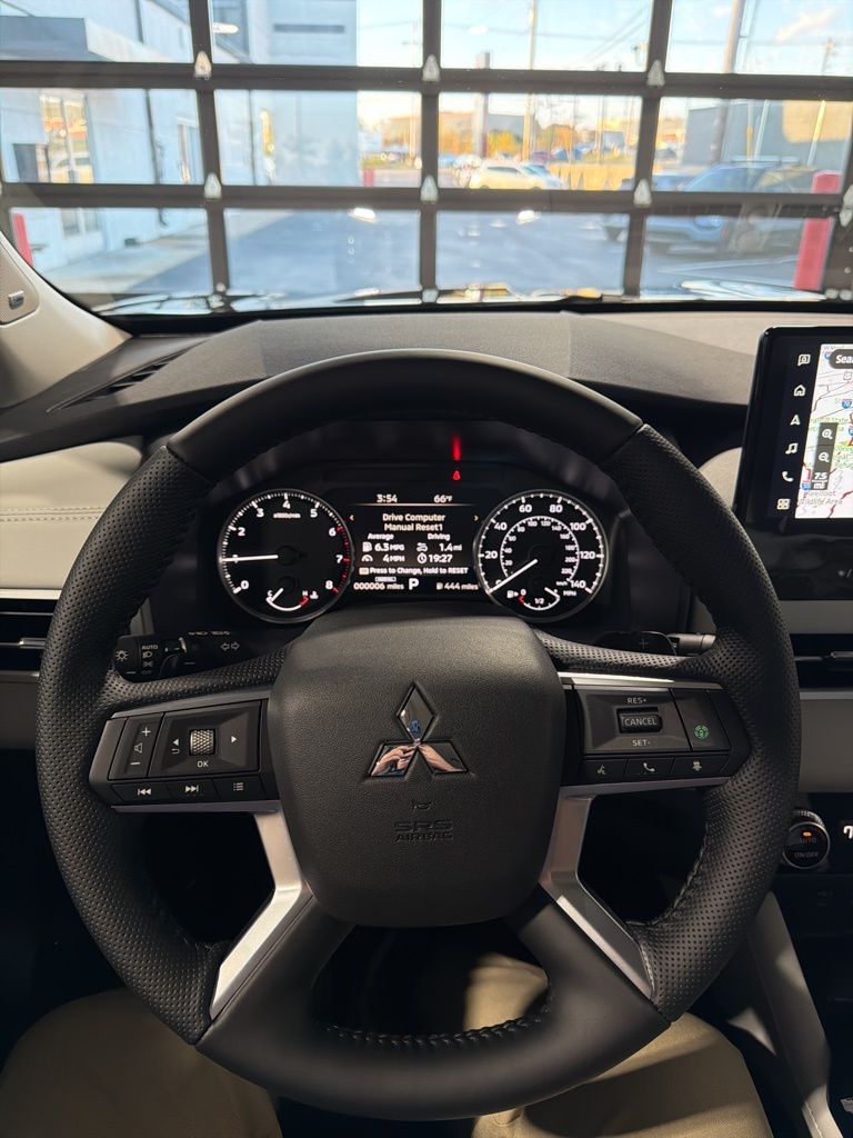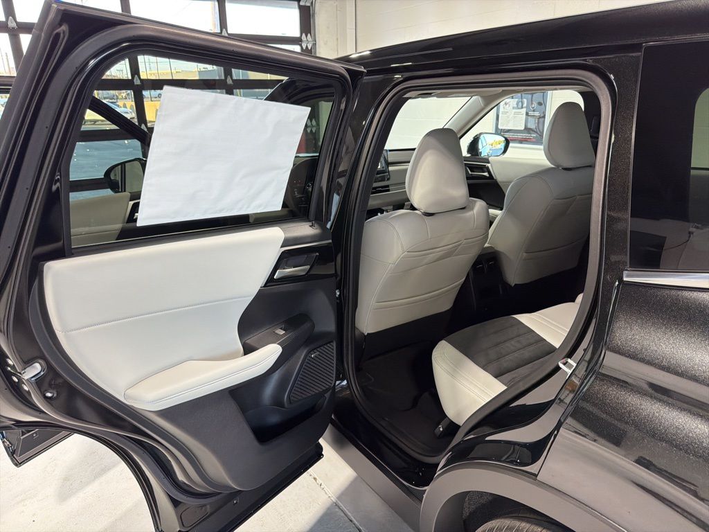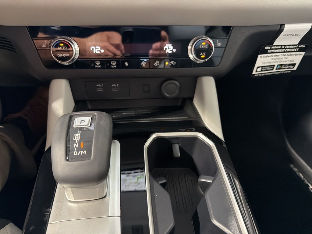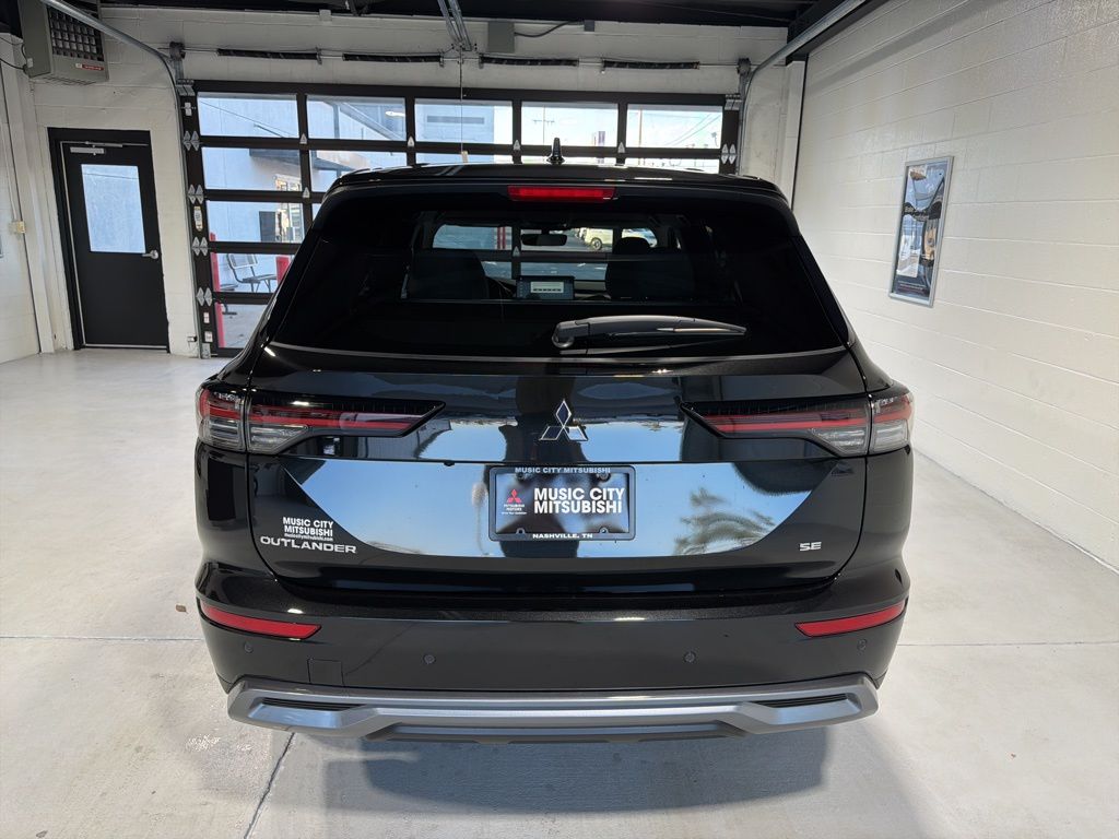 Black 2025 Mitsubishi Outlander SE FWD CVT 2.5L I4 DOHC 16V LEV3-SULEV30 181hp 3rd row seats: split-bench, 4-Wheel Disc Brakes, 8 Speakers, ABS brakes, Air Conditioning, Alloy wheels, AM/FM radio: SiriusXM, Android Auto & Apple CarPlay, Auto High-beam Headlights, Auto-dimming Rear-View mirror, Automatic temperature control, Brake assist, Bumpers: body-color, Driver door bin, Driver vanity mirror, Dual front impact airbags, Dual front side impact airbags, Electronic Stability Control, Emergency communication system: Mitsubishi Connect w/ 24-month trial, Exterior Parking Camera Rear, Four wheel independent suspension, Front anti-roll bar, Front Bucket Seats, Front Center Armrest w/Storage, Front dual zone A/C, Front fog lights, Front reading lights, Fully automatic headlights, Garage door transmitter: HomeLink, Heated door mirrors, Heated Front Bucket Seats, Heated front seats, Illuminated entry, Knee airbag, Leather Shift Knob, Leather steering wheel, Low tire pressure warning, Navigation System, Occupant sensing airbag, Outside temperature display, Overhead airbag, Overhead console, Panic alarm, Passenger door bin, Passenger vanity mirror, Power door mirrors, Power driver seat, Power Liftgate, Power steering, Power windows, Radio data system, Radio: AM/FM 12.3" Navigation w/Smartphone-Link, Rain sensing wipers, Rear anti-roll bar, Rear seat center armrest, Rear side impact airbag, Rear window defroster, Rear window wiper, Reclining 3rd row seat, Remote keyless entry, Security system, Speed control, Speed-Sensitive Wipers, Split folding rear seat, Spoiler, Steering wheel mounted audio controls, Synthetic Leather Seating Surfaces, Tachometer, Telescoping steering wheel, Tilt steering wheel, Traction control, Trip computer, Turn signal indicator mirrors, Variably intermittent wipers, Wheels: 20" Two-Tone Alloy.