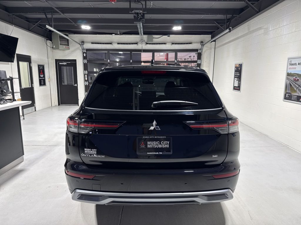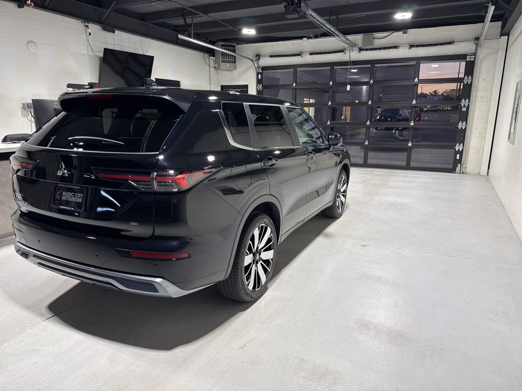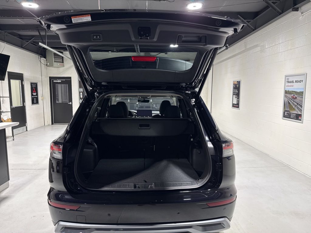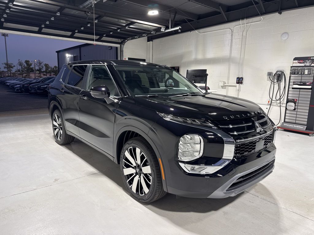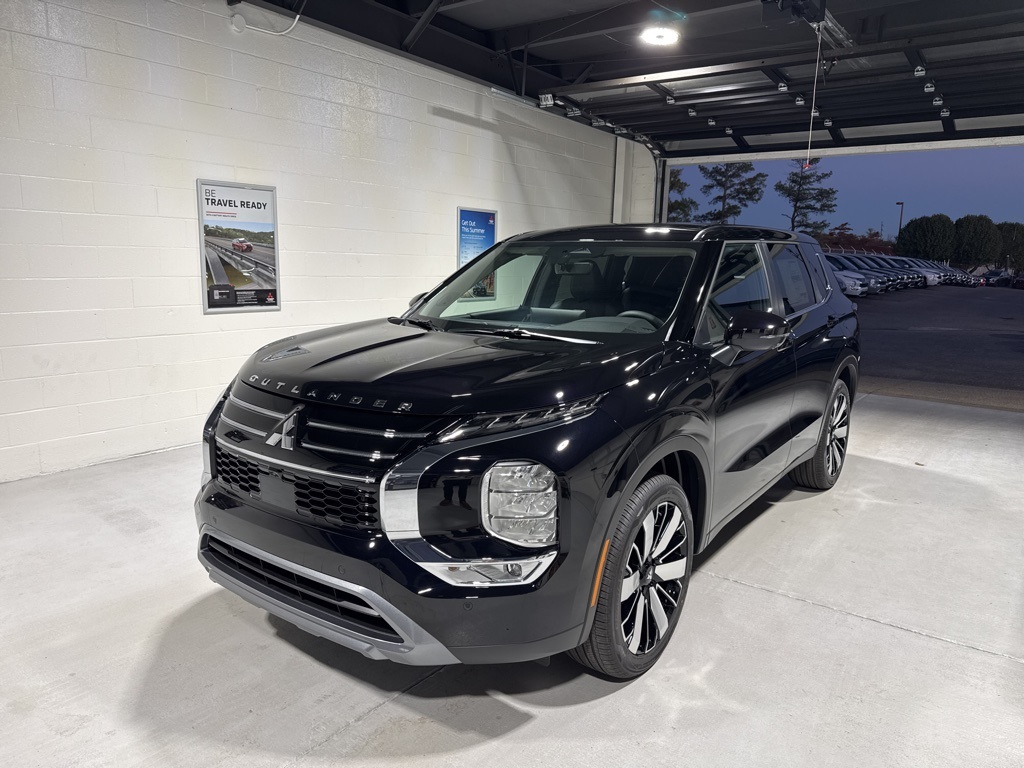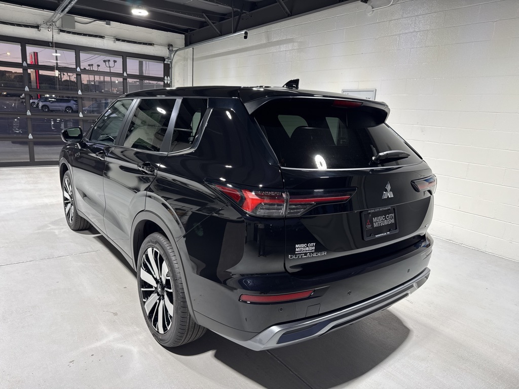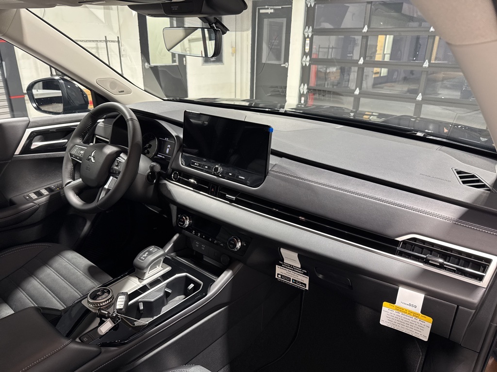 Black 2025 Mitsubishi Outlander SE FWD CVT 2.5L I4 DOHC 16V LEV3-SULEV30 181hp 3rd row seats: split-bench, 4-Wheel Disc Brakes, 8 Speakers, ABS brakes, Air Conditioning, Alloy wheels, AM/FM radio: SiriusXM, Android Auto & Apple CarPlay, Auto High-beam Headlights, Auto-dimming Rear-View mirror, Automatic temperature control, Brake assist, Bumpers: body-color, Driver door bin, Driver vanity mirror, Dual front impact airbags, Dual front side impact airbags, Electronic Stability Control, Emergency communication system: Mitsubishi Connect w/ 24-month trial, Exterior Parking Camera Rear, Four wheel independent suspension, Front anti-roll bar, Front Bucket Seats, Front Center Armrest w/Storage, Front dual zone A/C, Front fog lights, Front reading lights, Fully automatic headlights, Garage door transmitter: HomeLink, Heated door mirrors, Heated Front Bucket Seats, Heated front seats, Illuminated entry, Knee airbag, Leather Shift Knob, Leather steering wheel, Low tire pressure warning, Navigation System, Occupant sensing airbag, Outside temperature display, Overhead airbag, Overhead console, Panic alarm, Passenger door bin, Passenger vanity mirror, Power door mirrors, Power driver seat, Power Liftgate, Power steering, Power windows, Radio data system, Radio: AM/FM 12.3" Navigation w/Smartphone-Link, Rain sensing wipers, Rear anti-roll bar, Rear seat center armrest, Rear side impact airbag, Rear window defroster, Rear window wiper, Reclining 3rd row seat, Remote keyless entry, Security system, Speed control, Speed-Sensitive Wipers, Split folding rear seat, Spoiler, Steering wheel mounted audio controls, Synthetic Leather Seating Surfaces, Tachometer, Telescoping steering wheel, Tilt steering wheel, Traction control, Trip computer, Turn signal indicator mirrors, Variably intermittent wipers, Wheels: 20" Two-Tone Alloy.