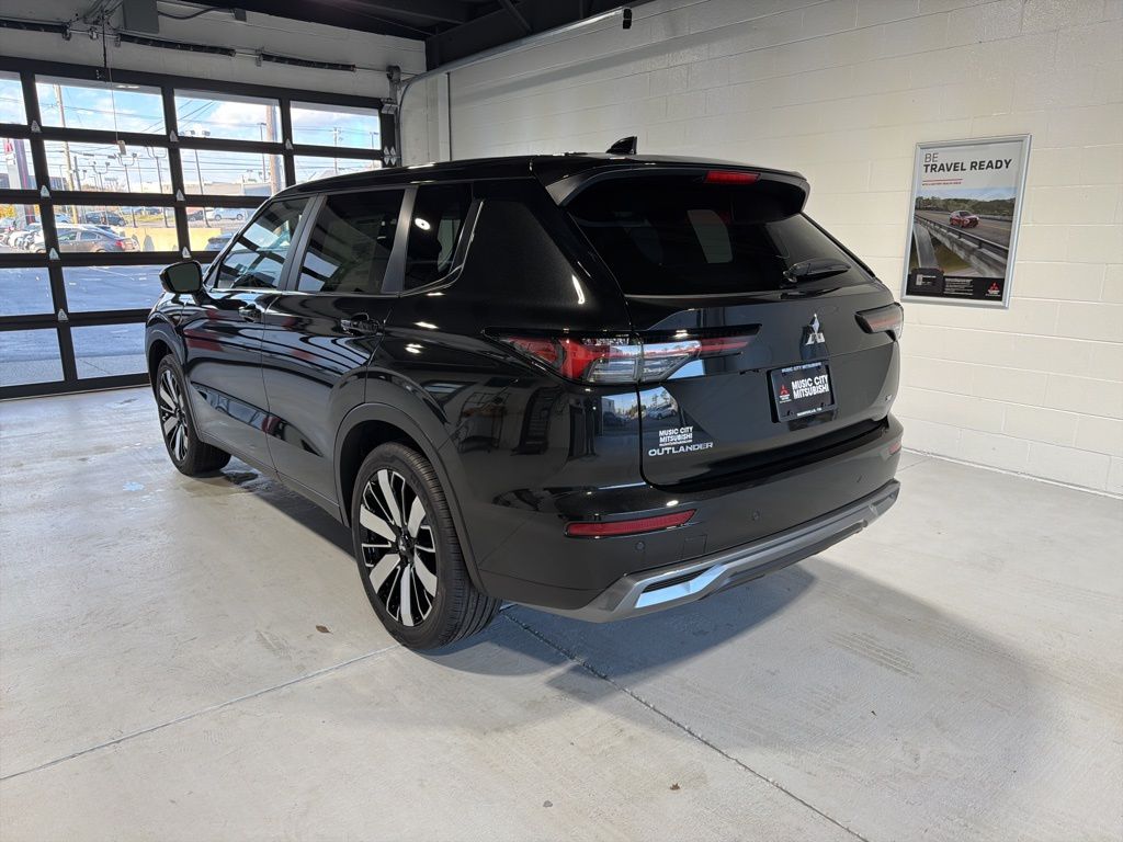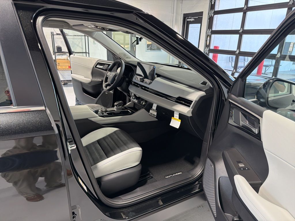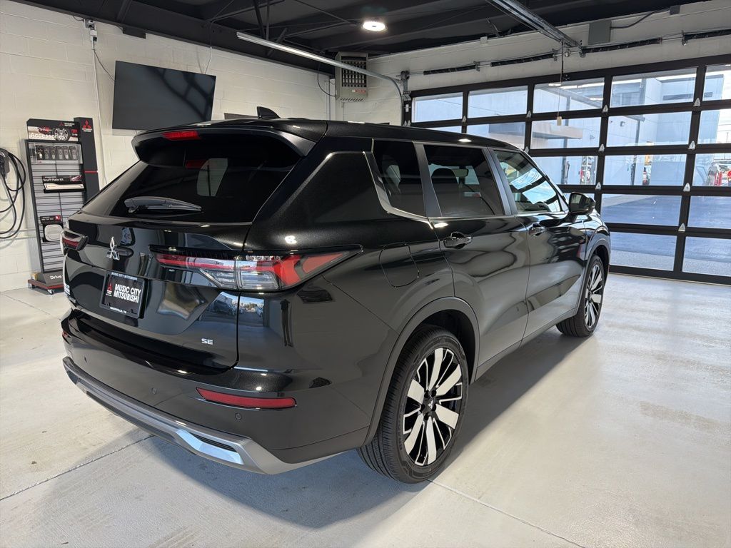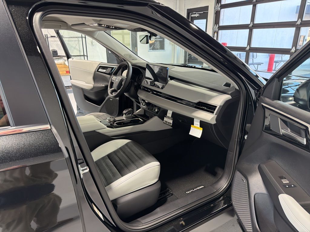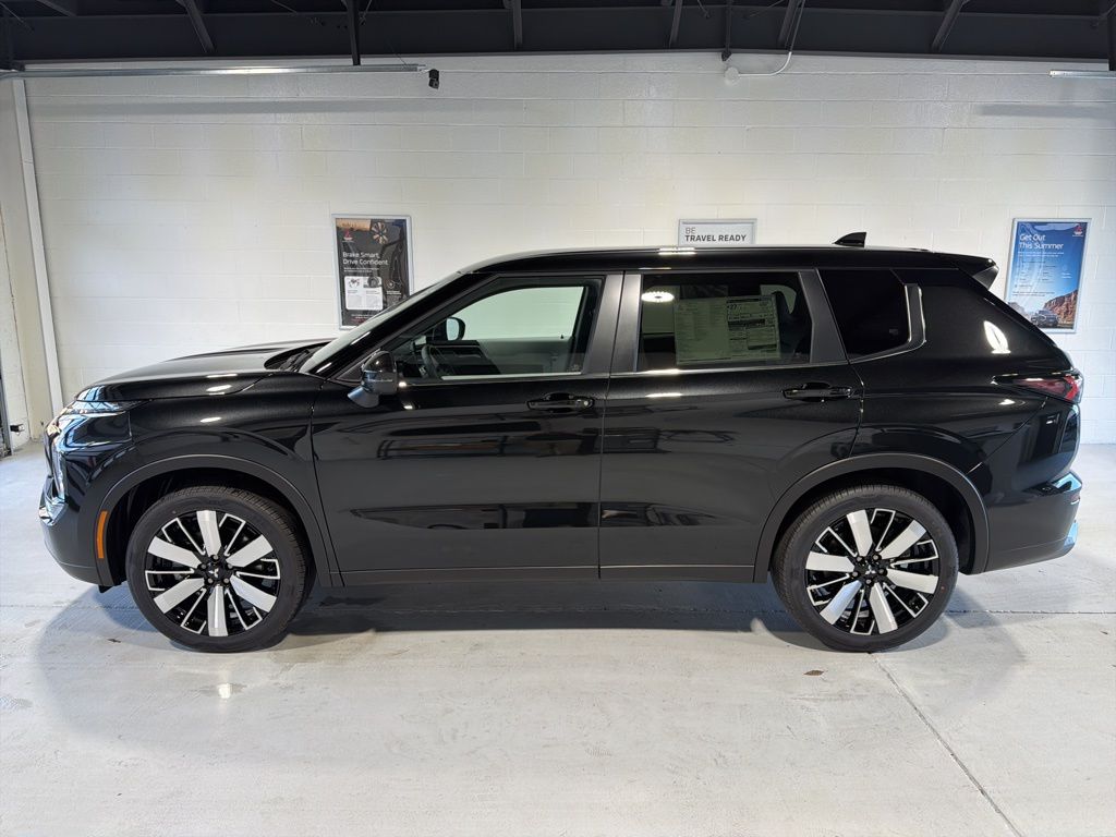 Black 2025 Mitsubishi Outlander SE FWD CVT 2.5L I4 DOHC 16V LEV3-SULEV30 181hp 3rd row seats: split-bench, 4-Wheel Disc Brakes, 8 Speakers, ABS brakes, Air Conditioning, Alloy wheels, AM/FM radio: SiriusXM, Android Auto & Apple CarPlay, Auto High-beam Headlights, Auto-dimming Rear-View mirror, Automatic temperature control, Brake assist, Bumpers: body-color, Driver door bin, Driver vanity mirror, Dual front impact airbags, Dual front side impact airbags, Electronic Stability Control, Emergency communication system: Mitsubishi Connect w/ 24-month trial, Exterior Parking Camera Rear, Four wheel independent suspension, Front anti-roll bar, Front Bucket Seats, Front Center Armrest w/Storage, Front dual zone A/C, Front fog lights, Front reading lights, Fully automatic headlights, Garage door transmitter: HomeLink, Heated door mirrors, Heated Front Bucket Seats, Heated front seats, Illuminated entry, Knee airbag, Leather Shift Knob, Leather steering wheel, Low tire pressure warning, Navigation System, Occupant sensing airbag, Outside temperature display, Overhead airbag, Overhead console, Panic alarm, Passenger door bin, Passenger vanity mirror, Power door mirrors, Power driver seat, Power Liftgate, Power steering, Power windows, Radio data system, Radio: AM/FM 12.3" Navigation w/Smartphone-Link, Rain sensing wipers, Rear anti-roll bar, Rear seat center armrest, Rear side impact airbag, Rear window defroster, Rear window wiper, Reclining 3rd row seat, Remote keyless entry, Security system, Speed control, Speed-Sensitive Wipers, Split folding rear seat, Spoiler, Steering wheel mounted audio controls, Synthetic Leather Seating Surfaces, Tachometer, Telescoping steering wheel, Tilt steering wheel, Traction control, Trip computer, Turn signal indicator mirrors, Variably intermittent wipers, Wheels: 20" Two-Tone Alloy.