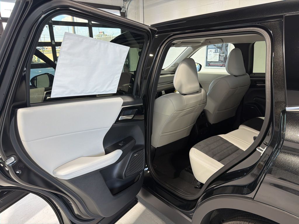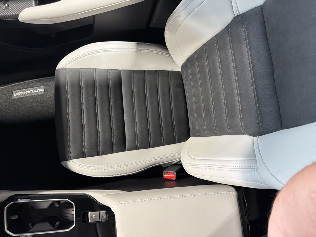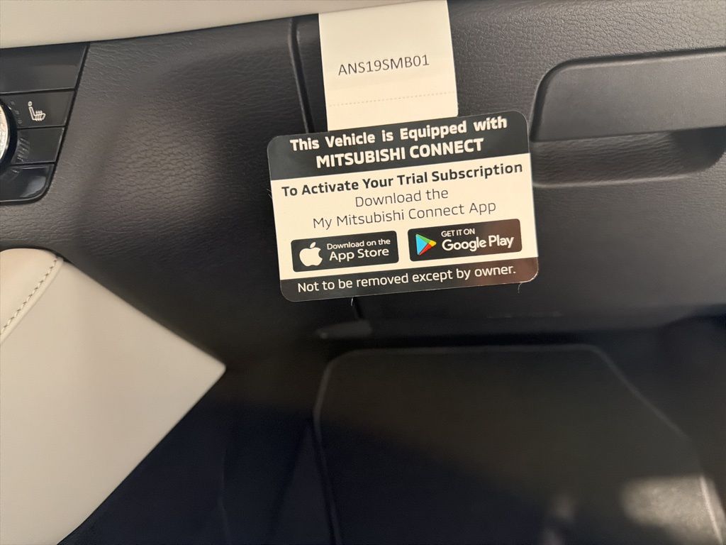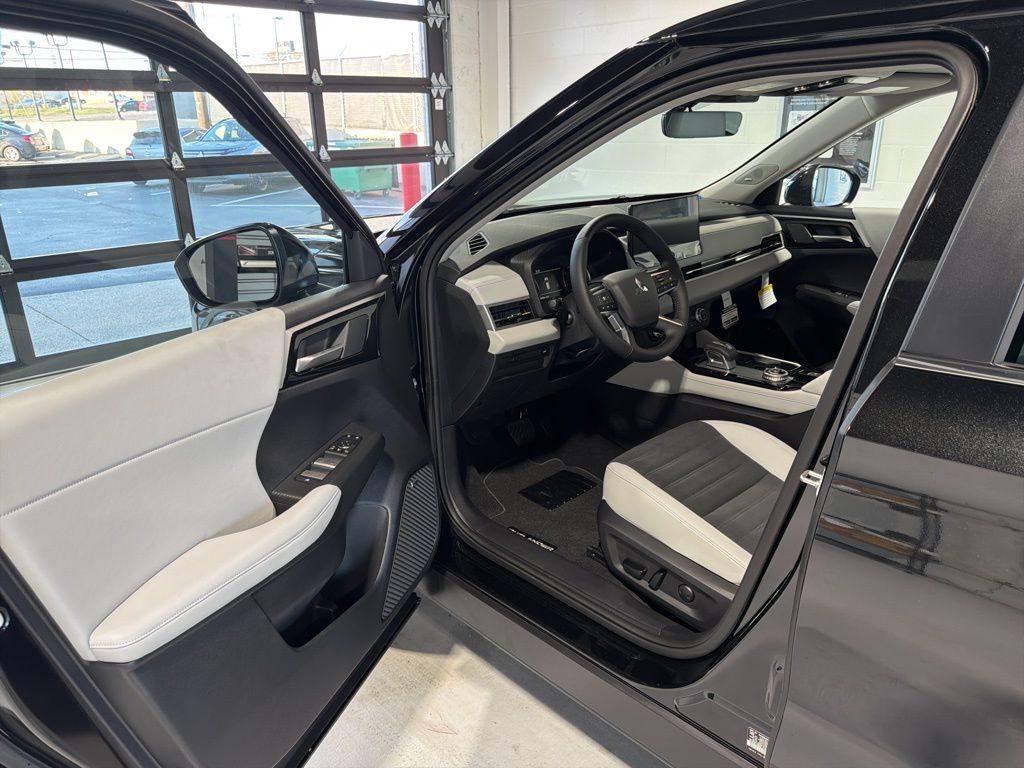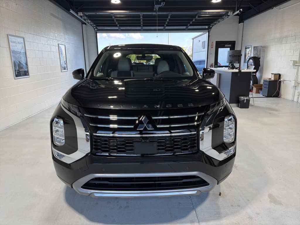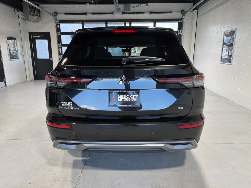 Black 2025 Mitsubishi Outlander SE FWD CVT 2.5L I4 DOHC 16V LEV3-SULEV30 181hp 3rd row seats: split-bench, 4-Wheel Disc Brakes, 8 Speakers, ABS brakes, Air Conditioning, Alloy wheels, AM/FM radio: SiriusXM, Android Auto & Apple CarPlay, Auto High-beam Headlights, Auto-dimming Rear-View mirror, Automatic temperature control, Brake assist, Bumpers: body-color, Driver door bin, Driver vanity mirror, Dual front impact airbags, Dual front side impact airbags, Electronic Stability Control, Emergency communication system: Mitsubishi Connect w/ 24-month trial, Exterior Parking Camera Rear, Four wheel independent suspension, Front anti-roll bar, Front Bucket Seats, Front Center Armrest w/Storage, Front dual zone A/C, Front fog lights, Front reading lights, Fully automatic headlights, Garage door transmitter: HomeLink, Heated door mirrors, Heated Front Bucket Seats, Heated front seats, Illuminated entry, Knee airbag, Leather Shift Knob, Leather steering wheel, Low tire pressure warning, Navigation System, Occupant sensing airbag, Outside temperature display, Overhead airbag, Overhead console, Panic alarm, Passenger door bin, Passenger vanity mirror, Power door mirrors, Power driver seat, Power Liftgate, Power steering, Power windows, Radio data system, Radio: AM/FM 12.3" Navigation w/Smartphone-Link, Rain sensing wipers, Rear anti-roll bar, Rear seat center armrest, Rear side impact airbag, Rear window defroster, Rear window wiper, Reclining 3rd row seat, Remote keyless entry, Security system, Speed control, Speed-Sensitive Wipers, Split folding rear seat, Spoiler, Steering wheel mounted audio controls, Synthetic Leather Seating Surfaces, Tachometer, Telescoping steering wheel, Tilt steering wheel, Traction control, Trip computer, Turn signal indicator mirrors, Variably intermittent wipers, Wheels: 20" Two-Tone Alloy.