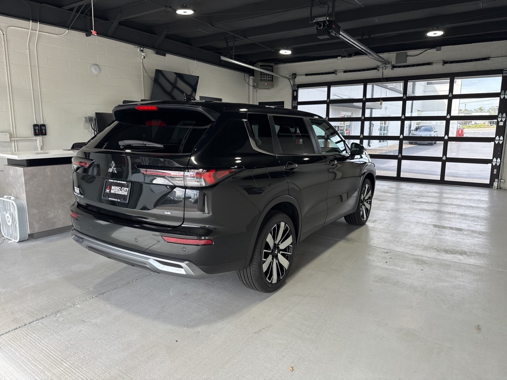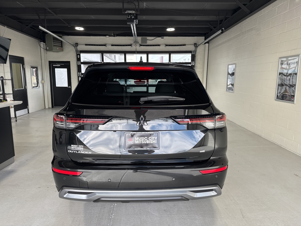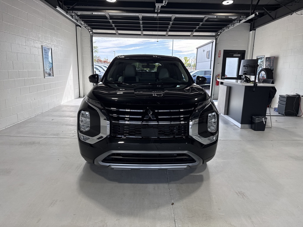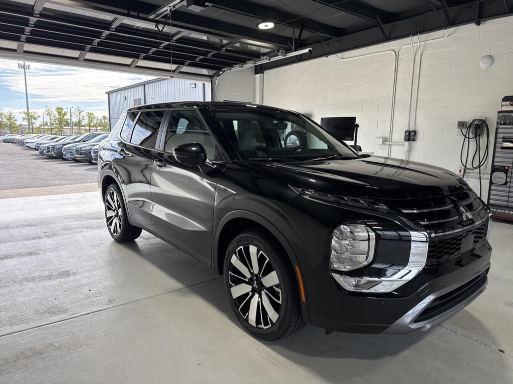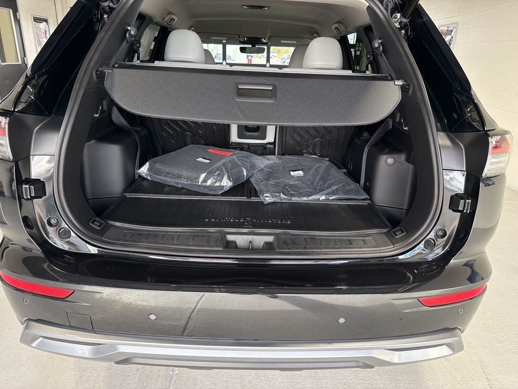 Black 2025 Mitsubishi Outlander SE FWD CVT 2.5L I4 DOHC 16V LEV3-SULEV30 181hp 3rd row seats: split-bench, 4-Wheel Disc Brakes, 8 Speakers, ABS brakes, Air Conditioning, Alloy wheels, AM/FM radio: SiriusXM, Android Auto & Apple CarPlay, Auto High-beam Headlights, Auto-dimming Rear-View mirror, Automatic temperature control, Brake assist, Bumpers: body-color, Driver door bin, Driver vanity mirror, Dual front impact airbags, Dual front side impact airbags, Electronic Stability Control, Emergency communication system: Mitsubishi Connect w/ 24-month trial, Exterior Parking Camera Rear, Four wheel independent suspension, Front anti-roll bar, Front Bucket Seats, Front Center Armrest w/Storage, Front dual zone A/C, Front fog lights, Front reading lights, Fully automatic headlights, Garage door transmitter: HomeLink, Heated door mirrors, Heated Front Bucket Seats, Heated front seats, Illuminated entry, Knee airbag, Leather Shift Knob, Leather steering wheel, Low tire pressure warning, Navigation System, Occupant sensing airbag, Outside temperature display, Overhead airbag, Overhead console, Panic alarm, Passenger door bin, Passenger vanity mirror, Power door mirrors, Power driver seat, Power Liftgate, Power steering, Power windows, Radio data system, Radio: AM/FM 12.3" Navigation w/Smartphone-Link, Rain sensing wipers, Rear anti-roll bar, Rear seat center armrest, Rear side impact airbag, Rear window defroster, Rear window wiper, Reclining 3rd row seat, Remote keyless entry, Security system, Speed control, Speed-Sensitive Wipers, Split folding rear seat, Spoiler, Steering wheel mounted audio controls, Synthetic Leather Seating Surfaces, Tachometer, Telescoping steering wheel, Tilt steering wheel, Traction control, Trip computer, Turn signal indicator mirrors, Variably intermittent wipers, Wheels: 20" Two-Tone Alloy.