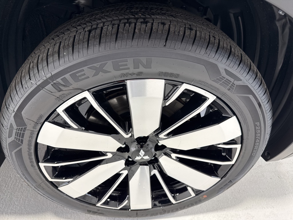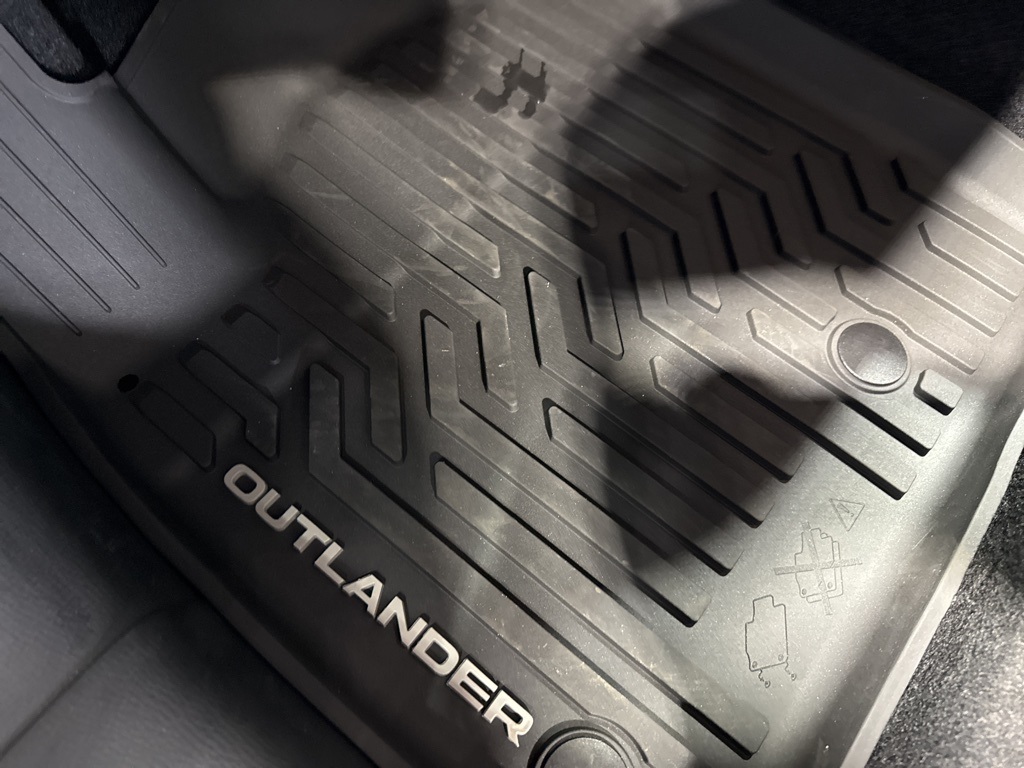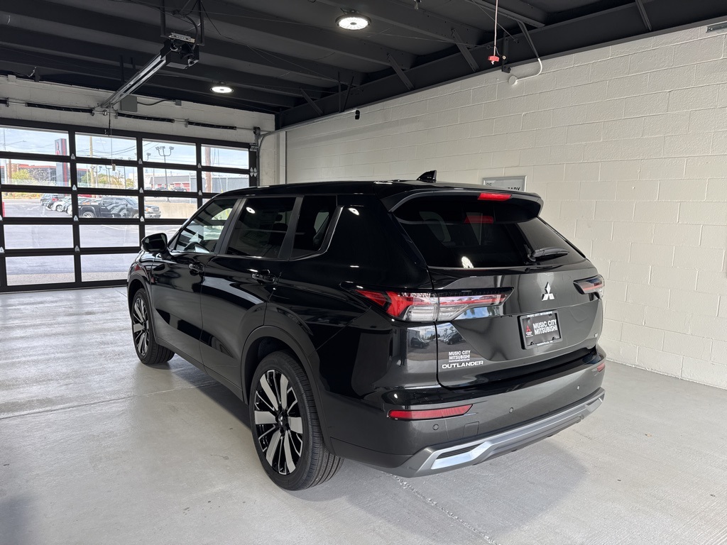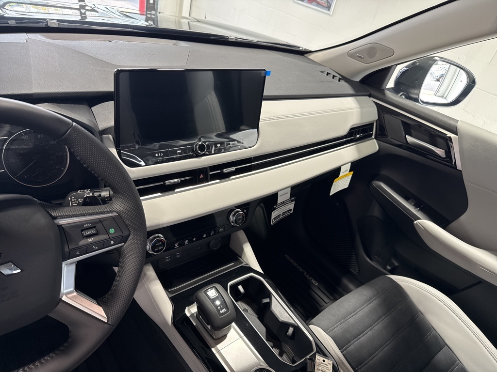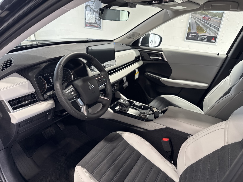 Black 2025 Mitsubishi Outlander SE FWD CVT 2.5L I4 DOHC 16V LEV3-SULEV30 181hp 3rd row seats: split-bench, 4-Wheel Disc Brakes, 8 Speakers, ABS brakes, Air Conditioning, Alloy wheels, AM/FM radio: SiriusXM, Android Auto & Apple CarPlay, Auto High-beam Headlights, Auto-dimming Rear-View mirror, Automatic temperature control, Brake assist, Bumpers: body-color, Driver door bin, Driver vanity mirror, Dual front impact airbags, Dual front side impact airbags, Electronic Stability Control, Emergency communication system: Mitsubishi Connect w/ 24-month trial, Exterior Parking Camera Rear, Four wheel independent suspension, Front anti-roll bar, Front Bucket Seats, Front Center Armrest w/Storage, Front dual zone A/C, Front fog lights, Front reading lights, Fully automatic headlights, Garage door transmitter: HomeLink, Heated door mirrors, Heated Front Bucket Seats, Heated front seats, Illuminated entry, Knee airbag, Leather Shift Knob, Leather steering wheel, Low tire pressure warning, Navigation System, Occupant sensing airbag, Outside temperature display, Overhead airbag, Overhead console, Panic alarm, Passenger door bin, Passenger vanity mirror, Power door mirrors, Power driver seat, Power Liftgate, Power steering, Power windows, Radio data system, Radio: AM/FM 12.3" Navigation w/Smartphone-Link, Rain sensing wipers, Rear anti-roll bar, Rear seat center armrest, Rear side impact airbag, Rear window defroster, Rear window wiper, Reclining 3rd row seat, Remote keyless entry, Security system, Speed control, Speed-Sensitive Wipers, Split folding rear seat, Spoiler, Steering wheel mounted audio controls, Synthetic Leather Seating Surfaces, Tachometer, Telescoping steering wheel, Tilt steering wheel, Traction control, Trip computer, Turn signal indicator mirrors, Variably intermittent wipers, Wheels: 20" Two-Tone Alloy.