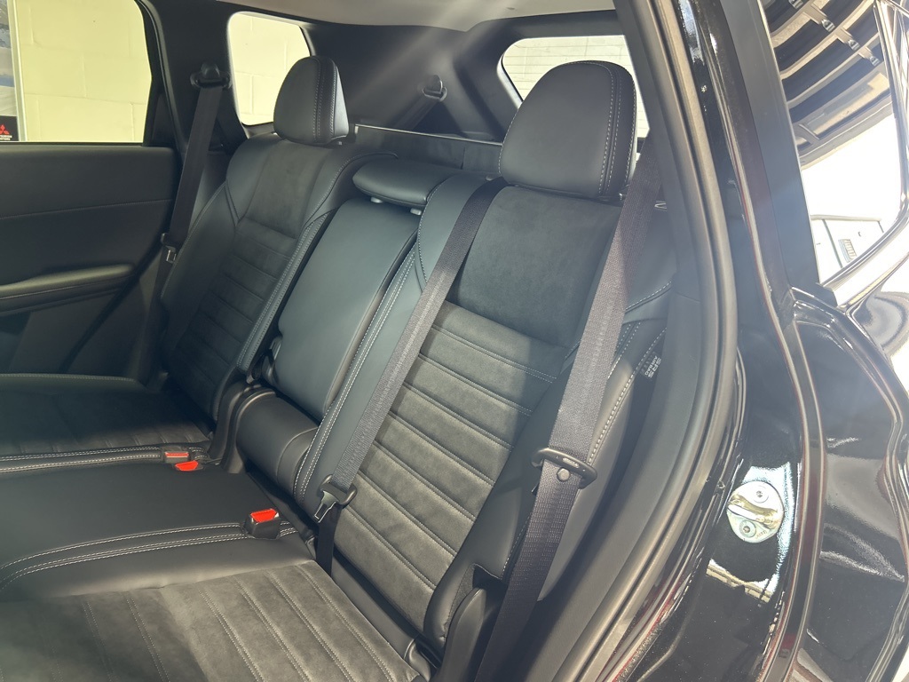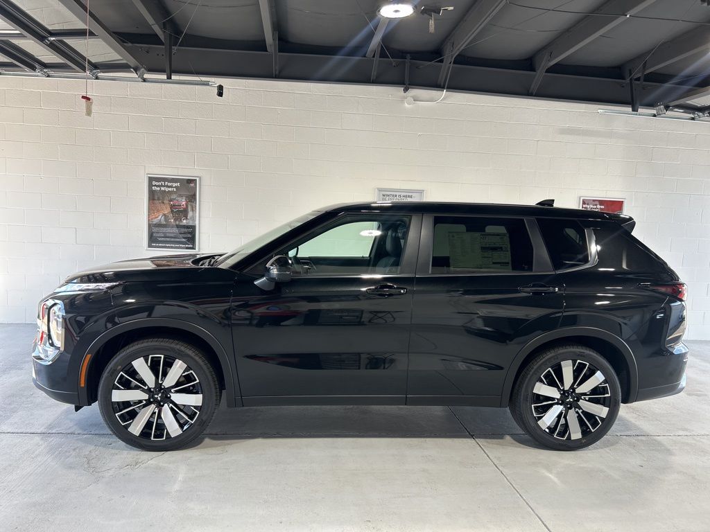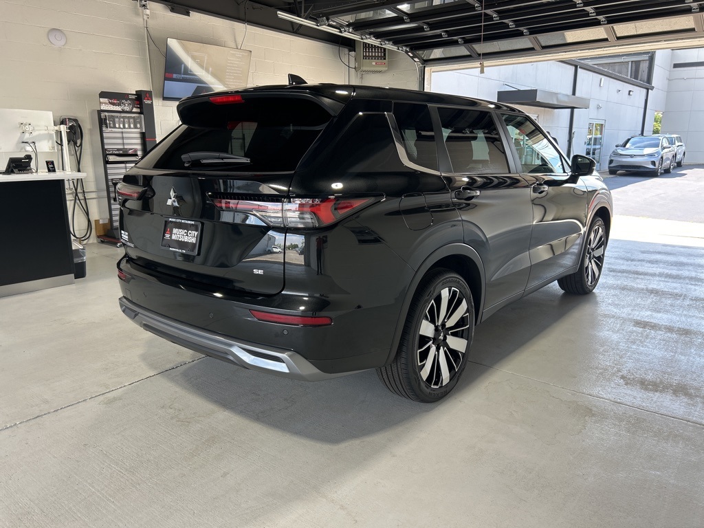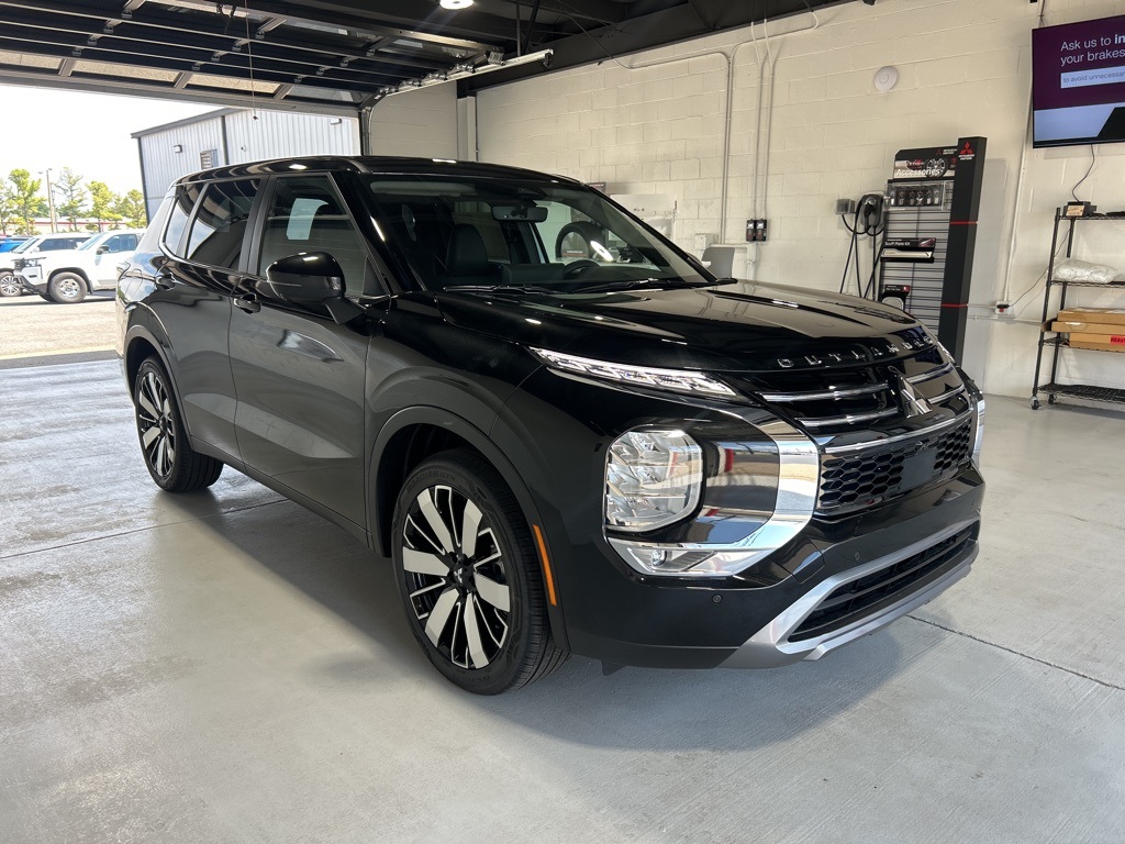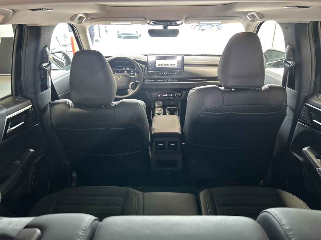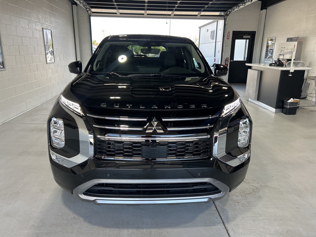 Black 2025 Mitsubishi Outlander SE FWD CVT 2.5L I4 DOHC 16V LEV3-SULEV30 181hp 3rd row seats: split-bench, 4-Wheel Disc Brakes, 8 Speakers, ABS brakes, Air Conditioning, Alloy wheels, AM/FM radio: SiriusXM, Android Auto & Apple CarPlay, Auto High-beam Headlights, Auto-dimming Rear-View mirror, Automatic temperature control, Brake assist, Bumpers: body-color, Driver door bin, Driver vanity mirror, Dual front impact airbags, Dual front side impact airbags, Electronic Stability Control, Emergency communication system: Mitsubishi Connect w/ 24-month trial, Exterior Parking Camera Rear, Four wheel independent suspension, Front anti-roll bar, Front Bucket Seats, Front Center Armrest w/Storage, Front dual zone A/C, Front fog lights, Front reading lights, Fully automatic headlights, Garage door transmitter: HomeLink, Heated door mirrors, Heated Front Bucket Seats, Heated front seats, Illuminated entry, Knee airbag, Leather Shift Knob, Leather steering wheel, Low tire pressure warning, Navigation System, Occupant sensing airbag, Outside temperature display, Overhead airbag, Overhead console, Panic alarm, Passenger door bin, Passenger vanity mirror, Power door mirrors, Power driver seat, Power Liftgate, Power steering, Power windows, Radio data system, Radio: AM/FM 12.3" Navigation w/Smartphone-Link, Rain sensing wipers, Rear anti-roll bar, Rear seat center armrest, Rear side impact airbag, Rear window defroster, Rear window wiper, Reclining 3rd row seat, Remote keyless entry, Security system, Speed control, Speed-Sensitive Wipers, Split folding rear seat, Spoiler, Steering wheel mounted audio controls, Synthetic Leather Seating Surfaces, Tachometer, Telescoping steering wheel, Tilt steering wheel, Traction control, Trip computer, Turn signal indicator mirrors, Variably intermittent wipers, Wheels: 20" Two-Tone Alloy.