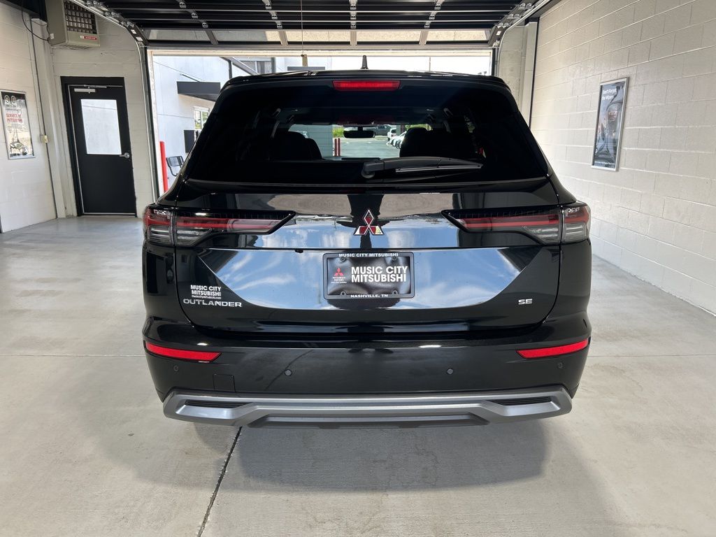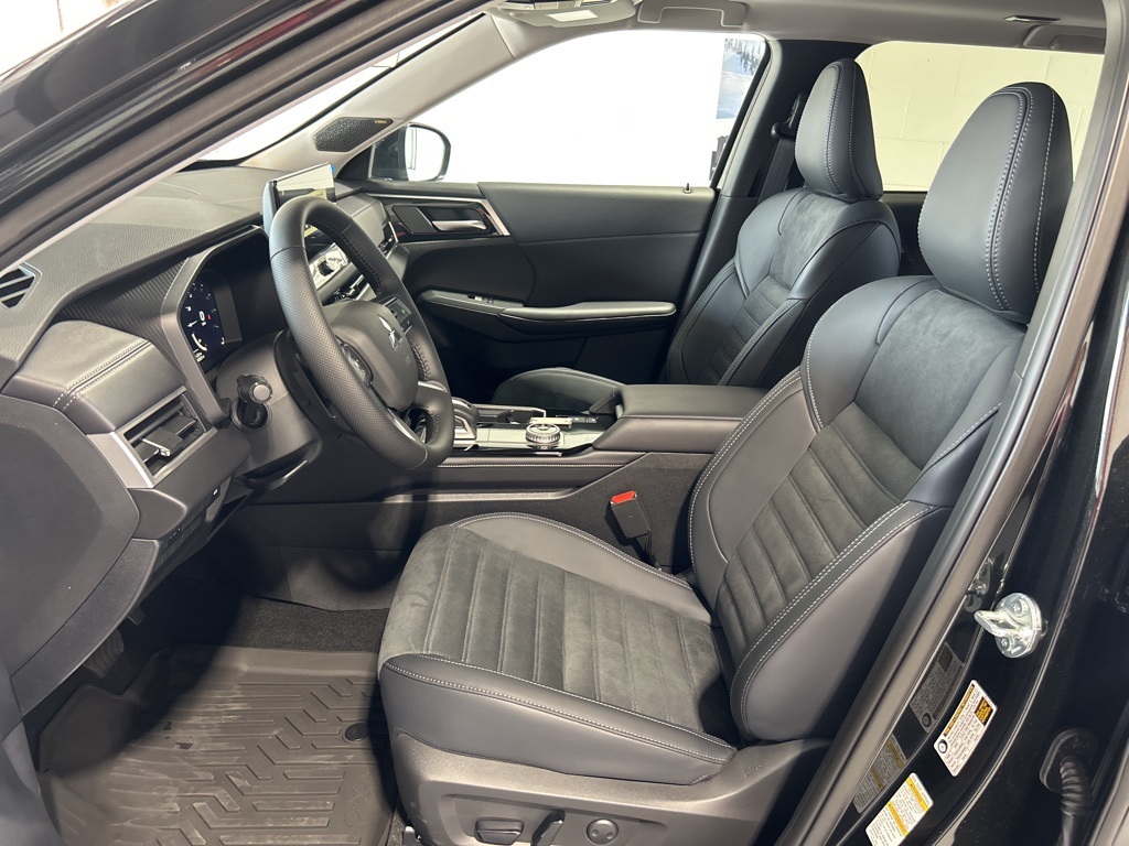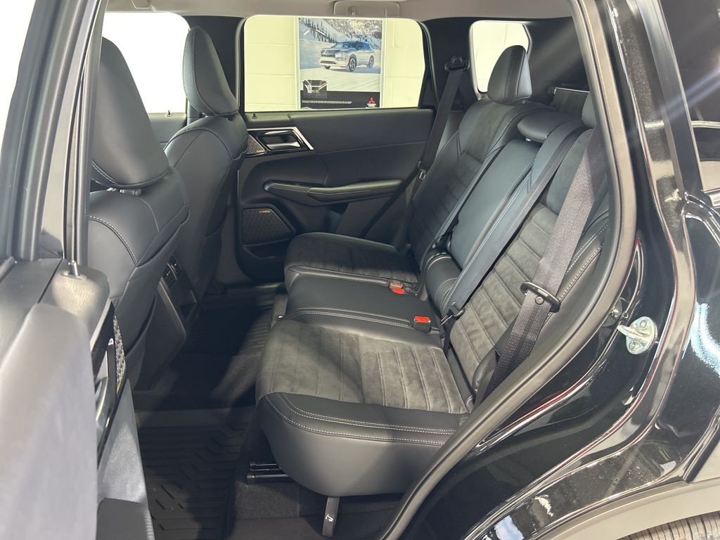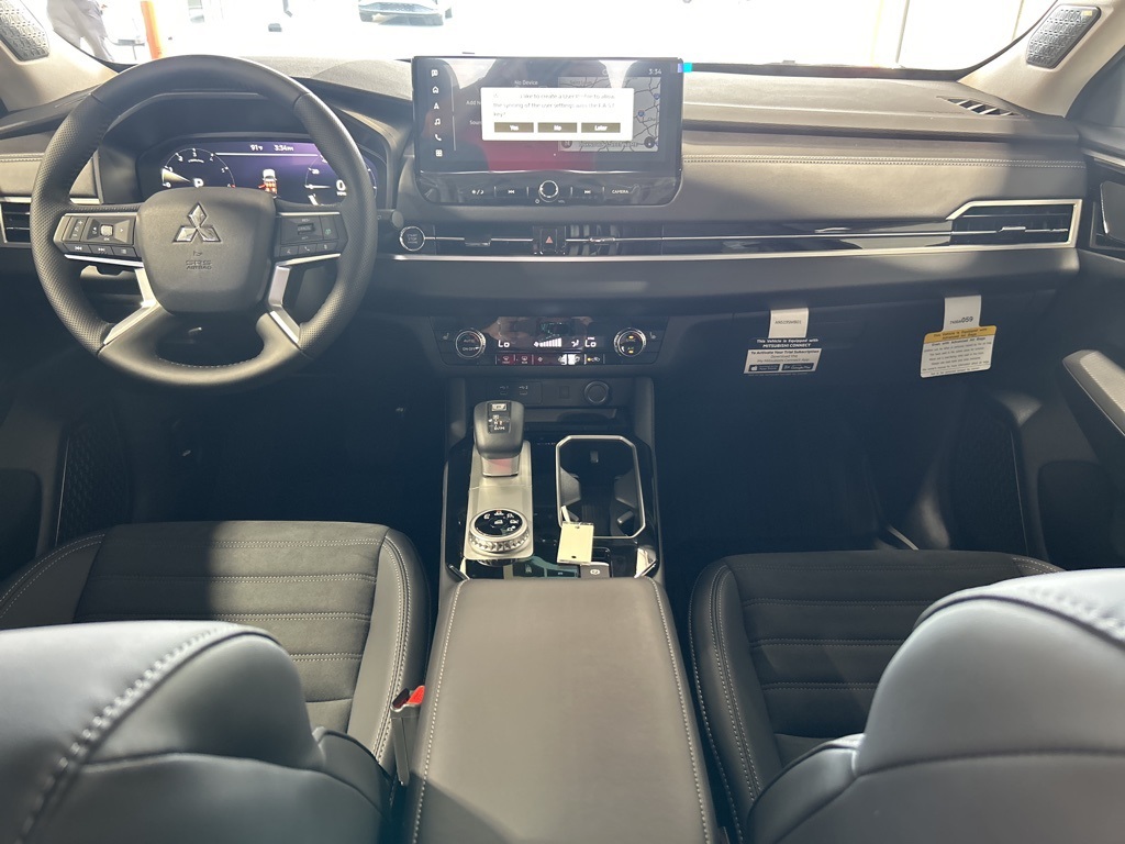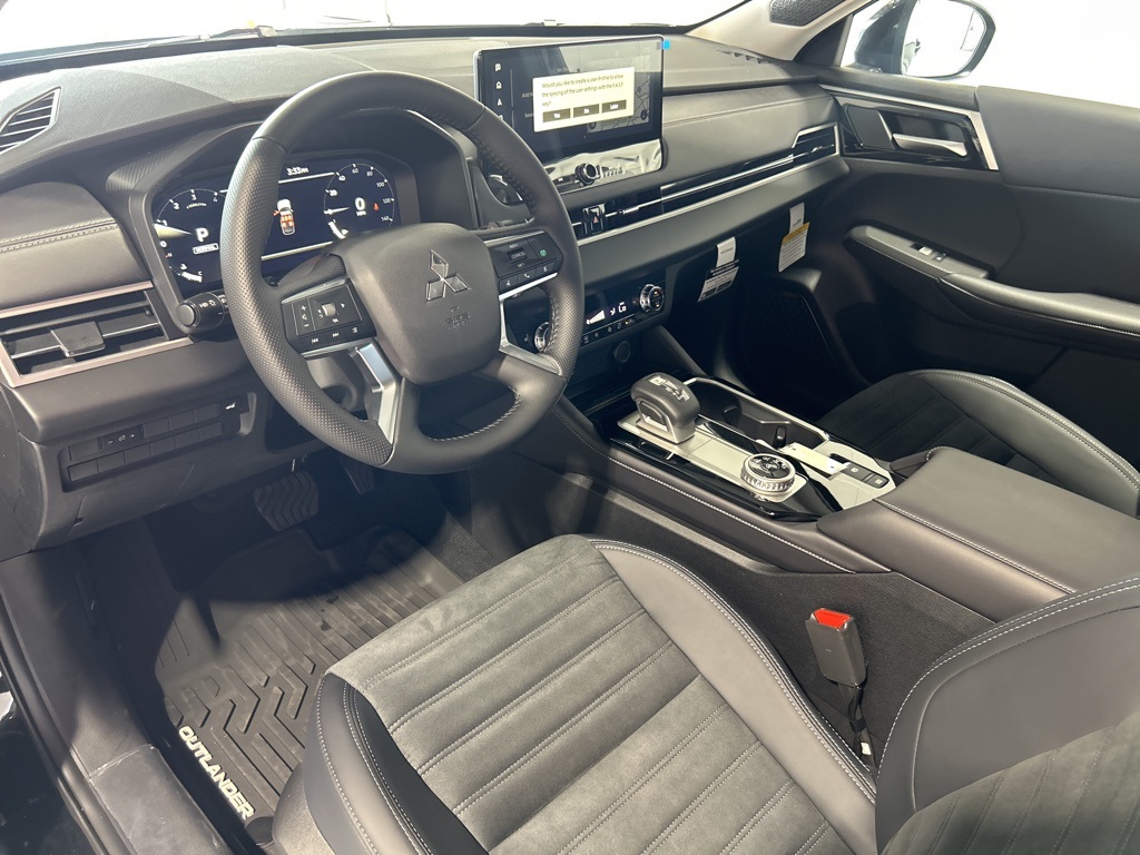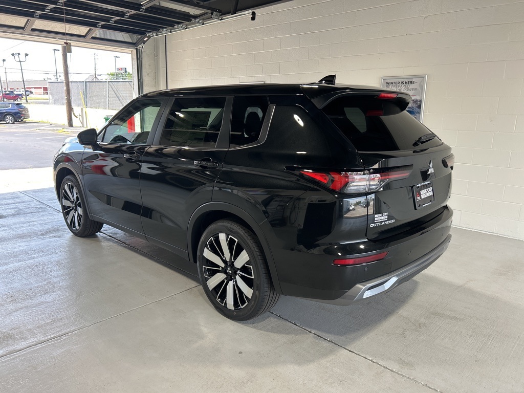 Black 2025 Mitsubishi Outlander SE FWD CVT 2.5L I4 DOHC 16V LEV3-SULEV30 181hp 3rd row seats: split-bench, 4-Wheel Disc Brakes, 8 Speakers, ABS brakes, Air Conditioning, Alloy wheels, AM/FM radio: SiriusXM, Android Auto & Apple CarPlay, Auto High-beam Headlights, Auto-dimming Rear-View mirror, Automatic temperature control, Brake assist, Bumpers: body-color, Driver door bin, Driver vanity mirror, Dual front impact airbags, Dual front side impact airbags, Electronic Stability Control, Emergency communication system: Mitsubishi Connect w/ 24-month trial, Exterior Parking Camera Rear, Four wheel independent suspension, Front anti-roll bar, Front Bucket Seats, Front Center Armrest w/Storage, Front dual zone A/C, Front fog lights, Front reading lights, Fully automatic headlights, Garage door transmitter: HomeLink, Heated door mirrors, Heated Front Bucket Seats, Heated front seats, Illuminated entry, Knee airbag, Leather Shift Knob, Leather steering wheel, Low tire pressure warning, Navigation System, Occupant sensing airbag, Outside temperature display, Overhead airbag, Overhead console, Panic alarm, Passenger door bin, Passenger vanity mirror, Power door mirrors, Power driver seat, Power Liftgate, Power steering, Power windows, Radio data system, Radio: AM/FM 12.3" Navigation w/Smartphone-Link, Rain sensing wipers, Rear anti-roll bar, Rear seat center armrest, Rear side impact airbag, Rear window defroster, Rear window wiper, Reclining 3rd row seat, Remote keyless entry, Security system, Speed control, Speed-Sensitive Wipers, Split folding rear seat, Spoiler, Steering wheel mounted audio controls, Synthetic Leather Seating Surfaces, Tachometer, Telescoping steering wheel, Tilt steering wheel, Traction control, Trip computer, Turn signal indicator mirrors, Variably intermittent wipers, Wheels: 20" Two-Tone Alloy.