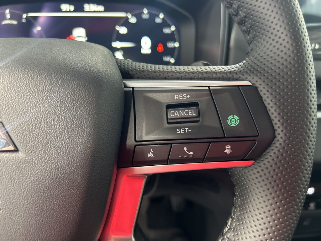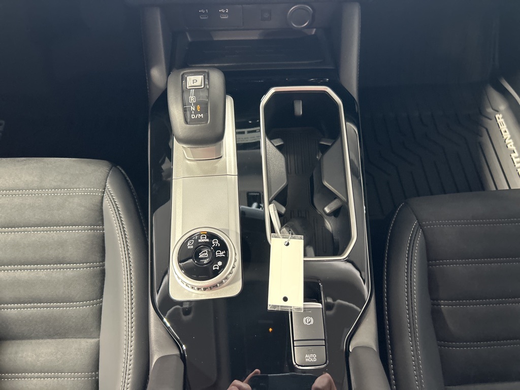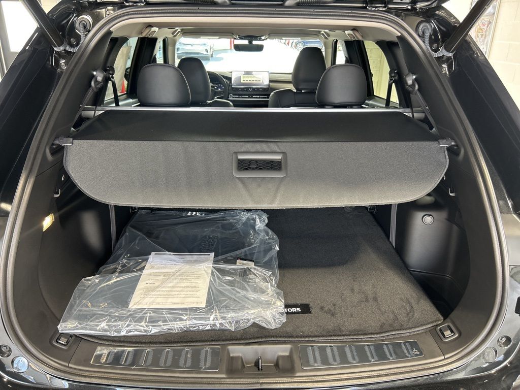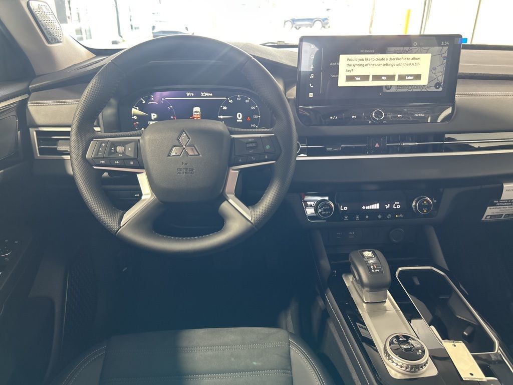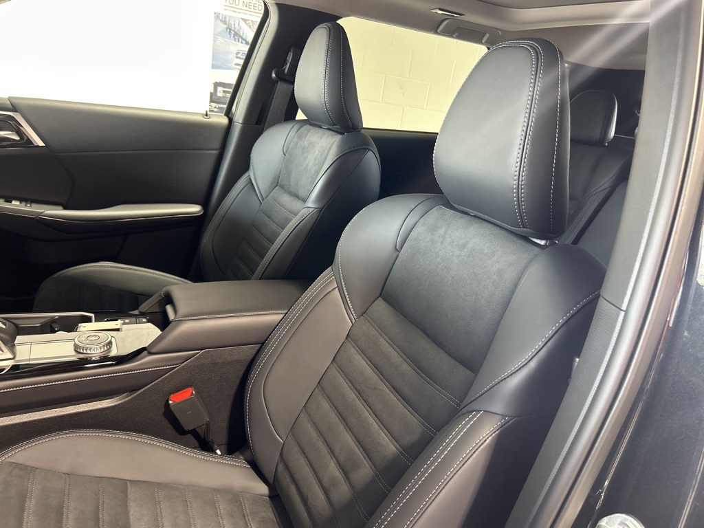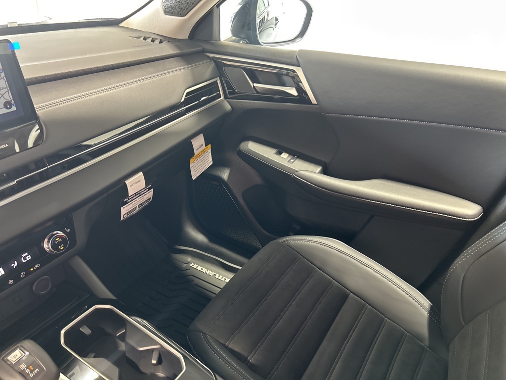 Black 2025 Mitsubishi Outlander SE FWD CVT 2.5L I4 DOHC 16V LEV3-SULEV30 181hp 3rd row seats: split-bench, 4-Wheel Disc Brakes, 8 Speakers, ABS brakes, Air Conditioning, Alloy wheels, AM/FM radio: SiriusXM, Android Auto & Apple CarPlay, Auto High-beam Headlights, Auto-dimming Rear-View mirror, Automatic temperature control, Brake assist, Bumpers: body-color, Driver door bin, Driver vanity mirror, Dual front impact airbags, Dual front side impact airbags, Electronic Stability Control, Emergency communication system: Mitsubishi Connect w/ 24-month trial, Exterior Parking Camera Rear, Four wheel independent suspension, Front anti-roll bar, Front Bucket Seats, Front Center Armrest w/Storage, Front dual zone A/C, Front fog lights, Front reading lights, Fully automatic headlights, Garage door transmitter: HomeLink, Heated door mirrors, Heated Front Bucket Seats, Heated front seats, Illuminated entry, Knee airbag, Leather Shift Knob, Leather steering wheel, Low tire pressure warning, Navigation System, Occupant sensing airbag, Outside temperature display, Overhead airbag, Overhead console, Panic alarm, Passenger door bin, Passenger vanity mirror, Power door mirrors, Power driver seat, Power Liftgate, Power steering, Power windows, Radio data system, Radio: AM/FM 12.3" Navigation w/Smartphone-Link, Rain sensing wipers, Rear anti-roll bar, Rear seat center armrest, Rear side impact airbag, Rear window defroster, Rear window wiper, Reclining 3rd row seat, Remote keyless entry, Security system, Speed control, Speed-Sensitive Wipers, Split folding rear seat, Spoiler, Steering wheel mounted audio controls, Synthetic Leather Seating Surfaces, Tachometer, Telescoping steering wheel, Tilt steering wheel, Traction control, Trip computer, Turn signal indicator mirrors, Variably intermittent wipers, Wheels: 20" Two-Tone Alloy.