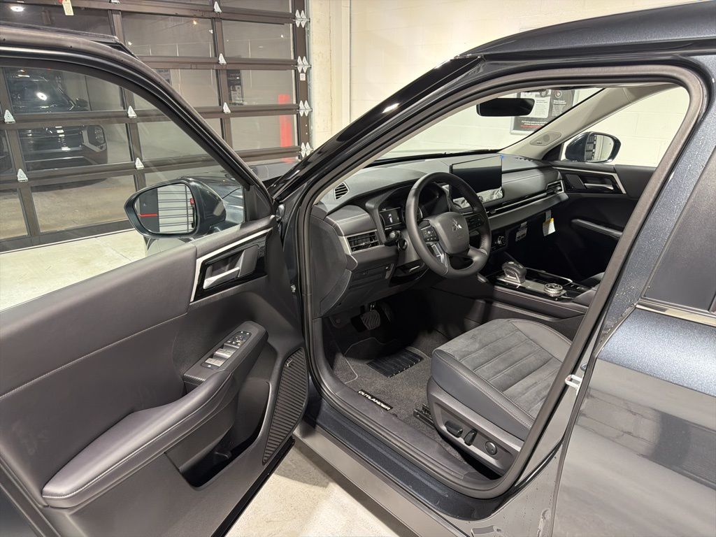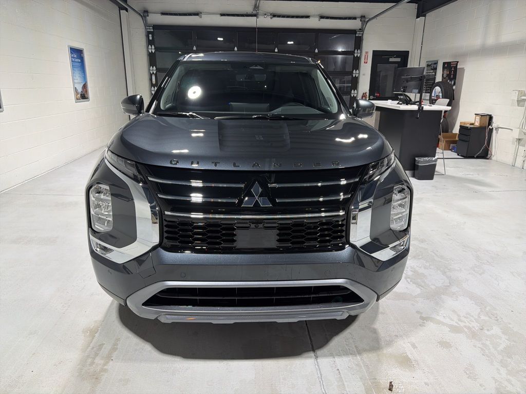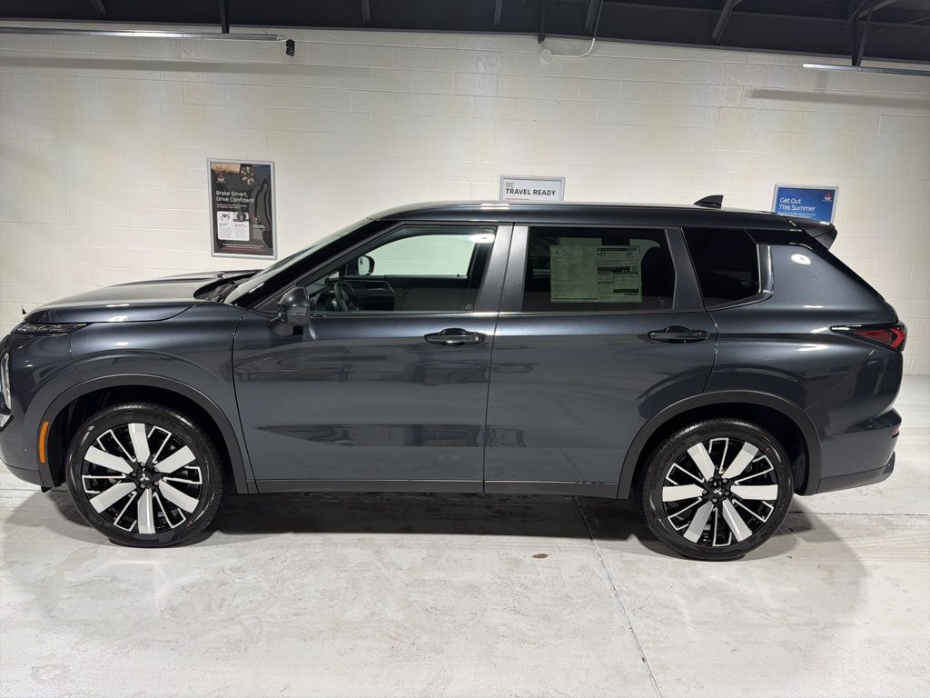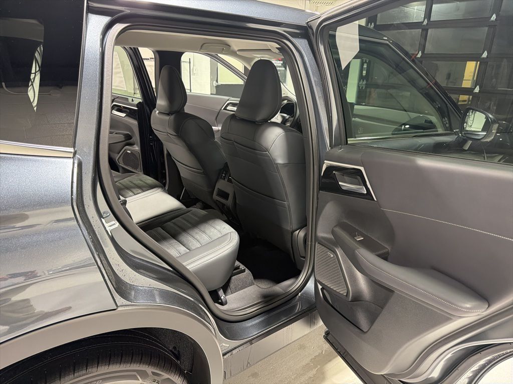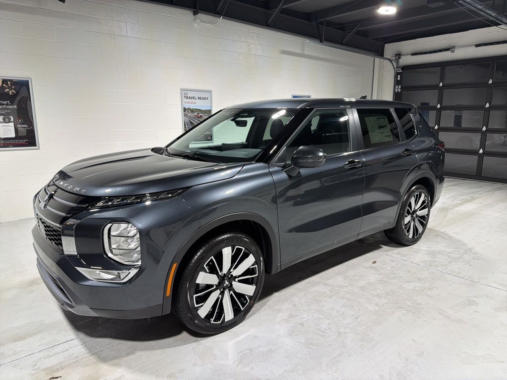 Gray 2025 Mitsubishi Outlander SE FWD CVT 2.5L I4 DOHC 16V LEV3-SULEV30 181hp 3rd row seats: split-bench, 4-Wheel Disc Brakes, 8 Speakers, ABS brakes, Air Conditioning, Alloy wheels, AM/FM radio: SiriusXM, Android Auto & Apple CarPlay, Auto High-beam Headlights, Auto-dimming Rear-View mirror, Automatic temperature control, Brake assist, Bumpers: body-color, Driver door bin, Driver vanity mirror, Dual front impact airbags, Dual front side impact airbags, Electronic Stability Control, Emergency communication system: Mitsubishi Connect w/ 24-month trial, Exterior Parking Camera Rear, Four wheel independent suspension, Front anti-roll bar, Front Bucket Seats, Front Center Armrest w/Storage, Front dual zone A/C, Front fog lights, Front reading lights, Fully automatic headlights, Garage door transmitter: HomeLink, Heated door mirrors, Heated Front Bucket Seats, Heated front seats, Illuminated entry, Knee airbag, Leather Shift Knob, Leather steering wheel, Low tire pressure warning, Navigation System, Occupant sensing airbag, Outside temperature display, Overhead airbag, Overhead console, Panic alarm, Passenger door bin, Passenger vanity mirror, Power door mirrors, Power driver seat, Power Liftgate, Power steering, Power windows, Radio data system, Radio: AM/FM 12.3" Navigation w/Smartphone-Link, Rain sensing wipers, Rear anti-roll bar, Rear seat center armrest, Rear side impact airbag, Rear window defroster, Rear window wiper, Reclining 3rd row seat, Remote keyless entry, Security system, Speed control, Speed-Sensitive Wipers, Split folding rear seat, Spoiler, Steering wheel mounted audio controls, Synthetic Leather Seating Surfaces, Tachometer, Telescoping steering wheel, Tilt steering wheel, Traction control, Trip computer, Turn signal indicator mirrors, Variably intermittent wipers, Wheels: 20" Two-Tone Alloy.