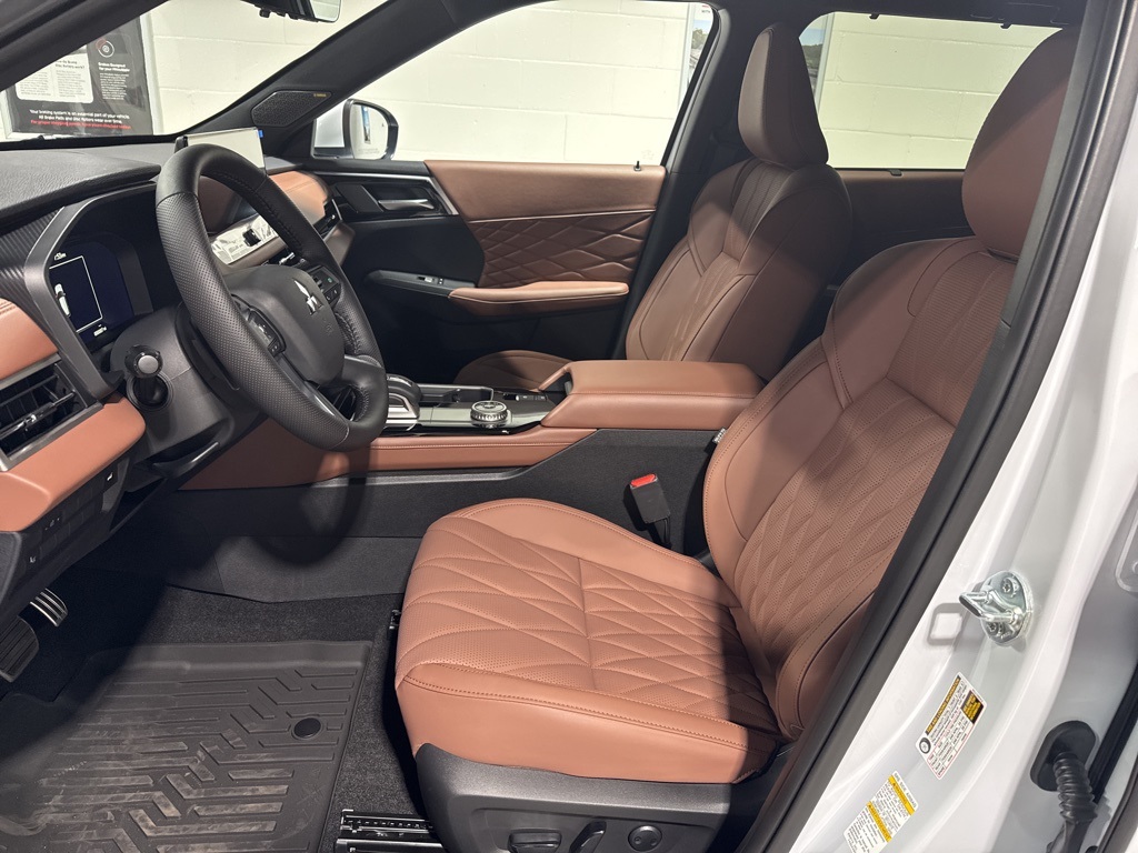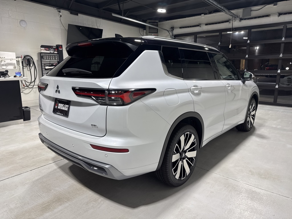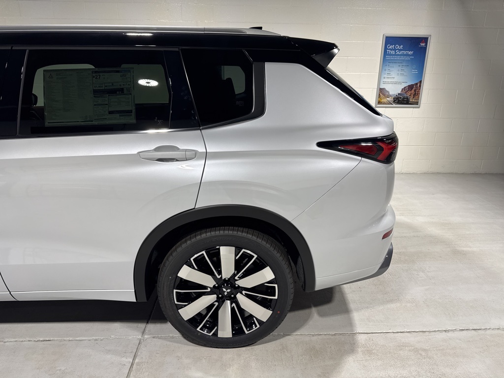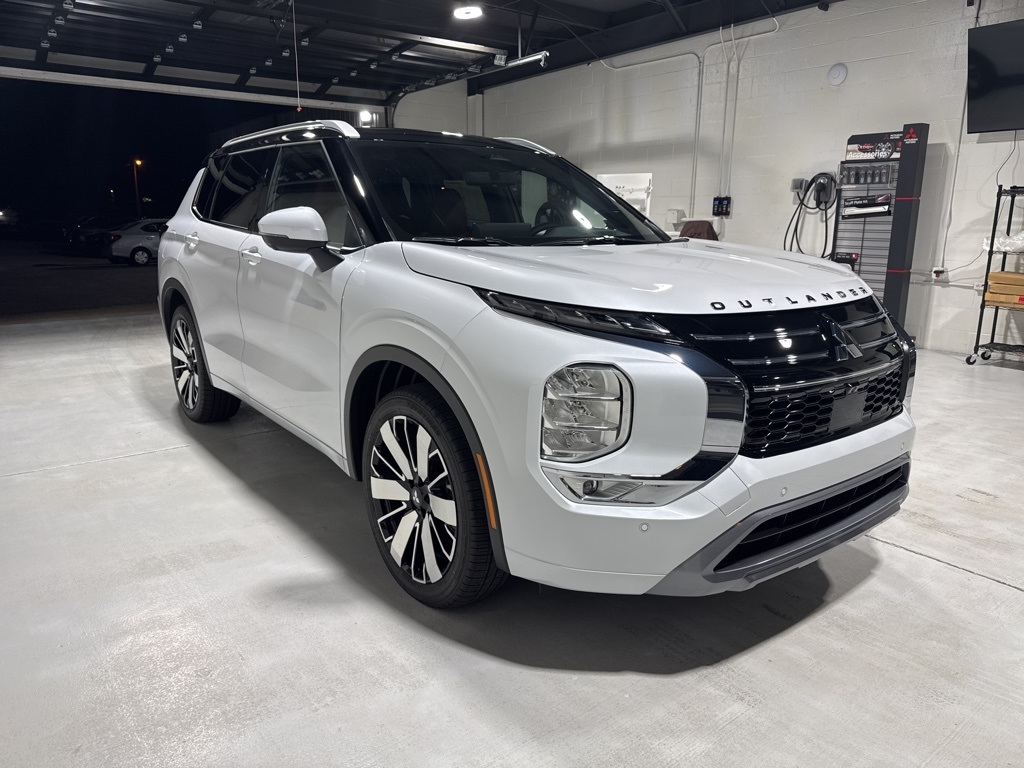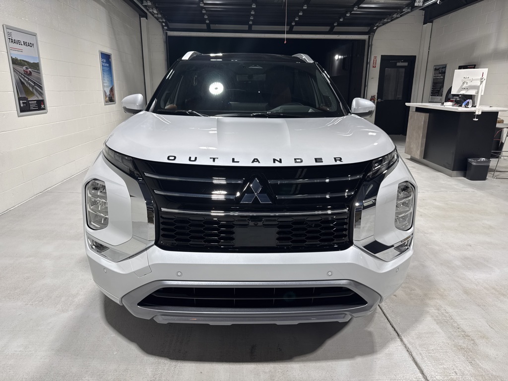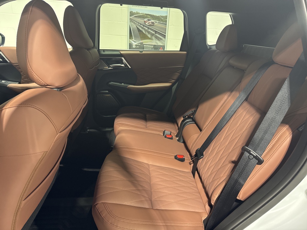 White 2025 Mitsubishi Outlander SEL FWD CVT 2.5L I4 DOHC 16V LEV3-SULEV30 181hp 3rd row seats: split-bench, 4-Wheel Disc Brakes, 8 Speakers, ABS brakes, Air Conditioning, Alloy wheels, AM/FM radio: SiriusXM, Android Auto & Apple CarPlay, Auto High-beam Headlights, Auto-dimming Rear-View mirror, Automatic temperature control, Brake assist, Bumpers: body-color, Driver door bin, Driver vanity mirror, Dual front impact airbags, Dual front side impact airbags, Electronic Stability Control, Emergency communication system: Mitsubishi Connect w/ 24-month trial, Exterior Parking Camera Rear, Four wheel independent suspension, Front anti-roll bar, Front Bucket Seats, Front Center Armrest w/Storage, Front dual zone A/C, Front fog lights, Front reading lights, Fully automatic headlights, Garage door transmitter: HomeLink, Heated door mirrors, Heated Front Bucket Seats, Heated front seats, Heated rear seats, Heated steering wheel, Illuminated entry, Knee airbag, Leather Appointed Seating Surfaces, Leather Shift Knob, Leather steering wheel, Low tire pressure warning, Memory seat, Navigation System, Occupant sensing airbag, Outside temperature display, Overhead airbag, Overhead console, Panic alarm, Passenger door bin, Passenger vanity mirror, Power door mirrors, Power driver seat, Power Liftgate, Power moonroof: Panoramic, Power passenger seat, Power steering, Power windows, Radio data system, Radio: AM/FM 12.3" Navigation w/Smartphone-Link, Rain sensing wipers, Rear air conditioning, Rear anti-roll bar, Rear seat center armrest, Rear side impact airbag, Rear window defroster, Rear window wiper, Reclining 3rd row seat, Remote keyless entry, Security system, Speed control, Speed-Sensitive Wipers, Split folding rear seat, Spoiler, Steering wheel mounted audio controls, Tachometer, Telescoping steering wheel, Tilt steering wheel, Traction control, Trip computer, Turn signal indicator mirrors, Variably intermittent wipers, Wheels: 20" Two-Tone Alloy.