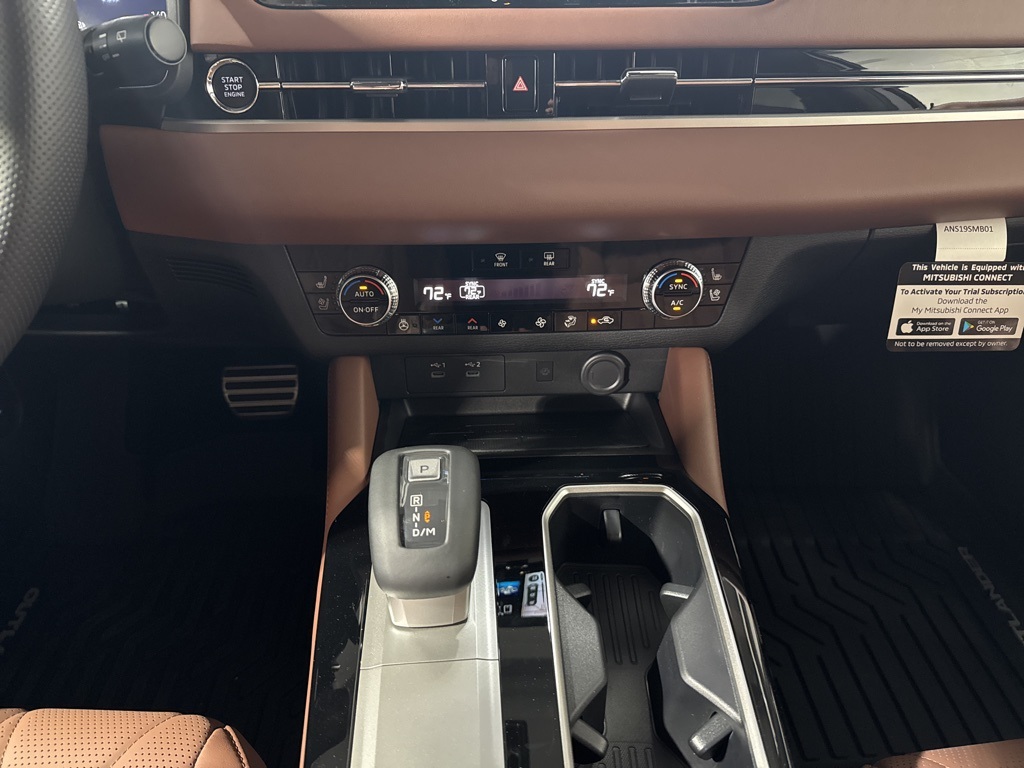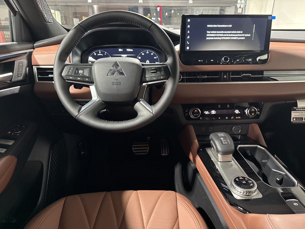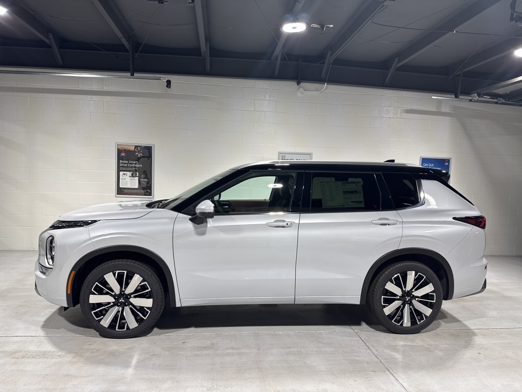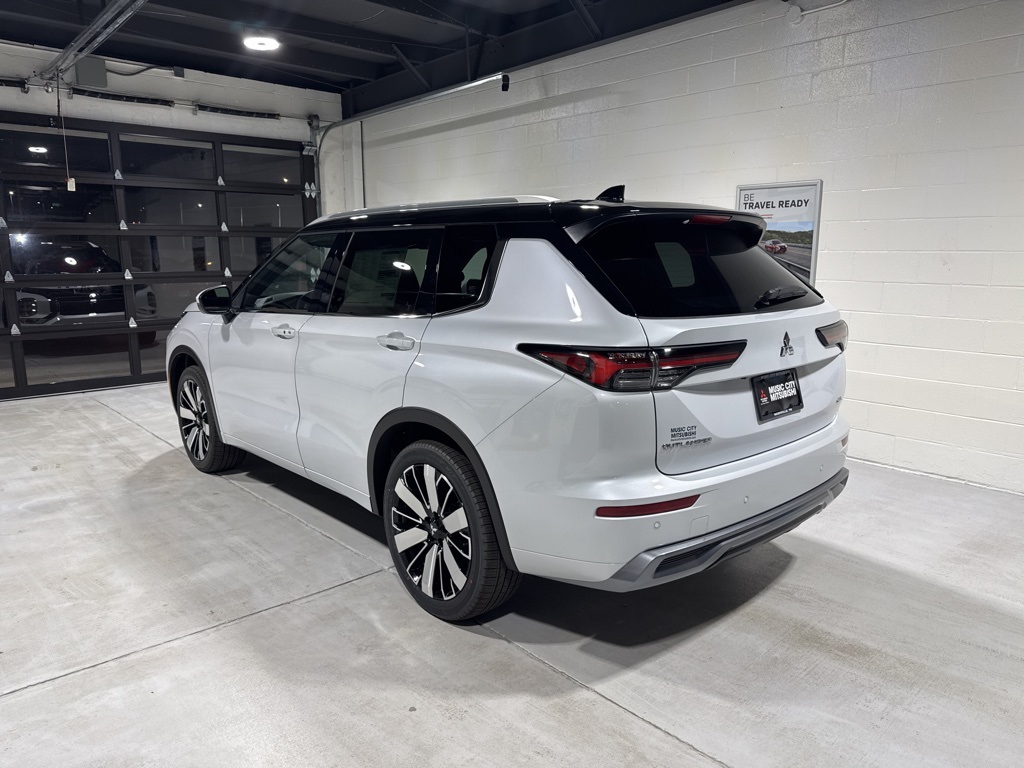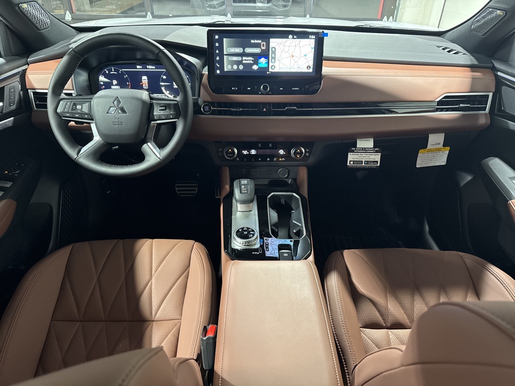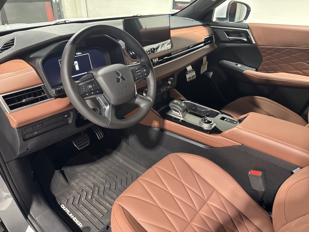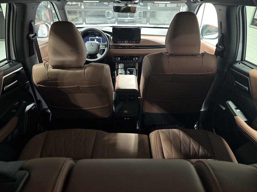 White 2025 Mitsubishi Outlander SEL FWD CVT 2.5L I4 DOHC 16V LEV3-SULEV30 181hp 3rd row seats: split-bench, 4-Wheel Disc Brakes, 8 Speakers, ABS brakes, Air Conditioning, Alloy wheels, AM/FM radio: SiriusXM, Android Auto & Apple CarPlay, Auto High-beam Headlights, Auto-dimming Rear-View mirror, Automatic temperature control, Brake assist, Bumpers: body-color, Driver door bin, Driver vanity mirror, Dual front impact airbags, Dual front side impact airbags, Electronic Stability Control, Emergency communication system: Mitsubishi Connect w/ 24-month trial, Exterior Parking Camera Rear, Four wheel independent suspension, Front anti-roll bar, Front Bucket Seats, Front Center Armrest w/Storage, Front dual zone A/C, Front fog lights, Front reading lights, Fully automatic headlights, Garage door transmitter: HomeLink, Heated door mirrors, Heated Front Bucket Seats, Heated front seats, Heated rear seats, Heated steering wheel, Illuminated entry, Knee airbag, Leather Appointed Seating Surfaces, Leather Shift Knob, Leather steering wheel, Low tire pressure warning, Memory seat, Navigation System, Occupant sensing airbag, Outside temperature display, Overhead airbag, Overhead console, Panic alarm, Passenger door bin, Passenger vanity mirror, Power door mirrors, Power driver seat, Power Liftgate, Power moonroof: Panoramic, Power passenger seat, Power steering, Power windows, Radio data system, Radio: AM/FM 12.3" Navigation w/Smartphone-Link, Rain sensing wipers, Rear air conditioning, Rear anti-roll bar, Rear seat center armrest, Rear side impact airbag, Rear window defroster, Rear window wiper, Reclining 3rd row seat, Remote keyless entry, Security system, Speed control, Speed-Sensitive Wipers, Split folding rear seat, Spoiler, Steering wheel mounted audio controls, Tachometer, Telescoping steering wheel, Tilt steering wheel, Traction control, Trip computer, Turn signal indicator mirrors, Variably intermittent wipers, Wheels: 20" Two-Tone Alloy.