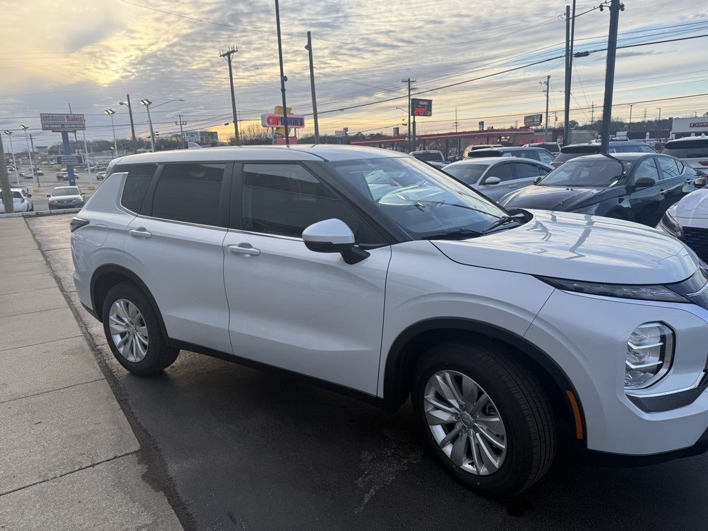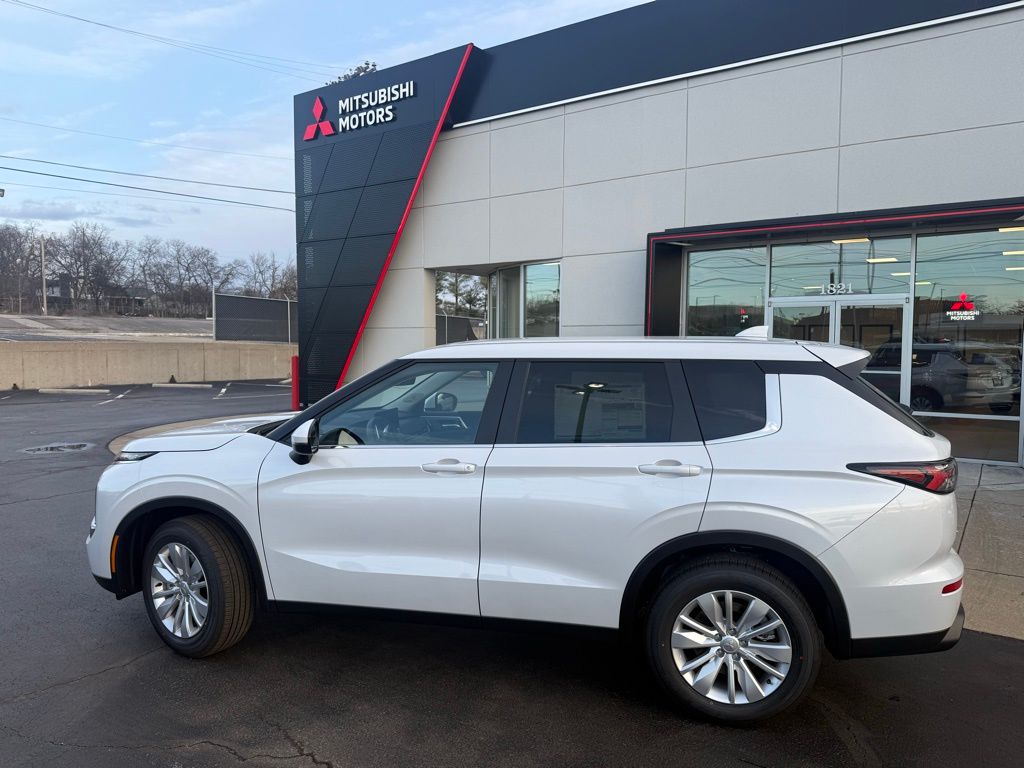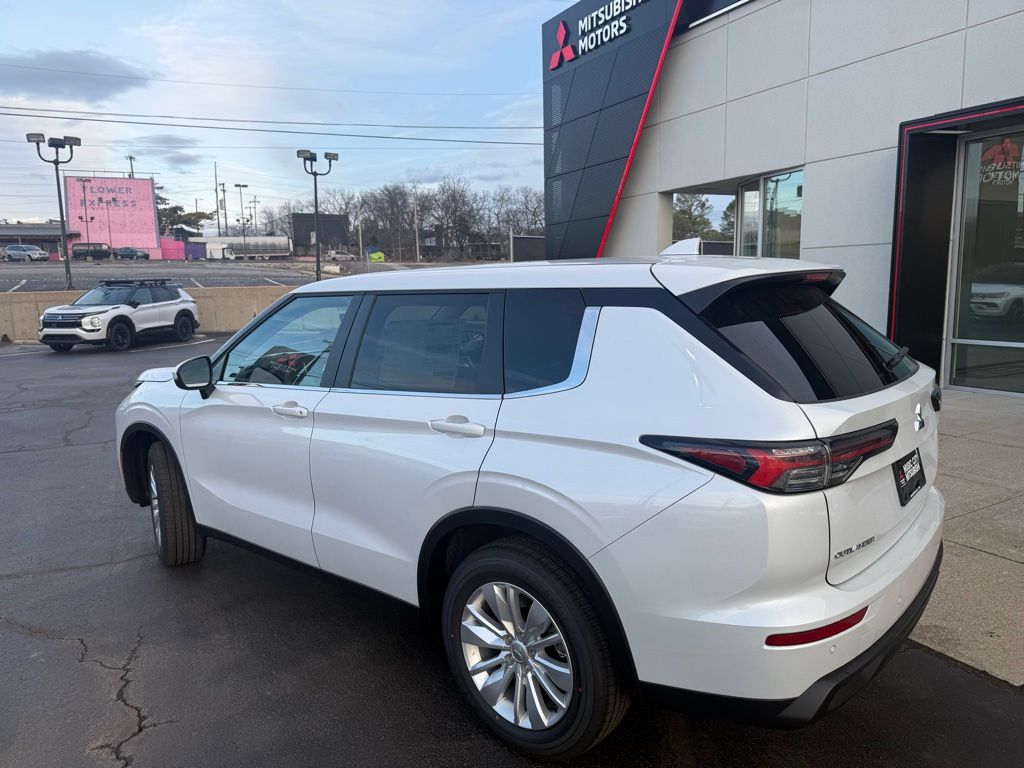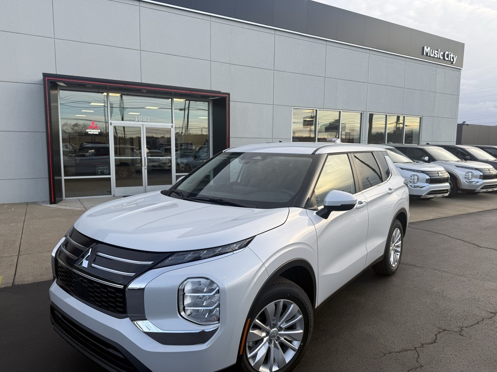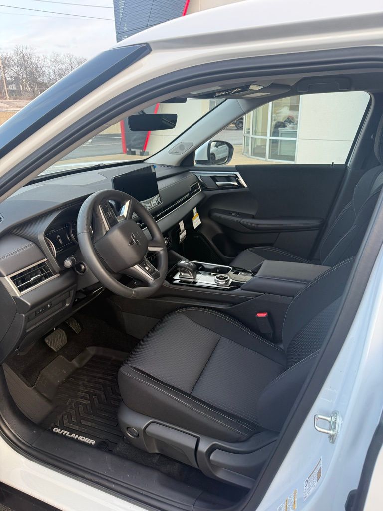White 2026 Mitsubishi Outlander ES FWD CVT 1.5L I4 Turbocharged DOHC 16V LEV3-SULEV30 174hp 18" Alloy Wheels, 3rd row seats: split-bench, 4-Wheel Disc Brakes, 8 Speakers, ABS brakes, Air Conditioning, Alloy wheels, AM/FM radio: SiriusXM, Android Auto & Apple CarPlay, Auto High-beam Headlights, Auto-dimming Rear-View mirror, Automatic temperature control, Blind Spot Warning, Brake assist, Bumpers: body-color, Cloth Fabric Seating Surfaces, Driver door bin, Driver vanity mirror, Dual front impact airbags, Dual front side impact airbags, Electronic Stability Control, Emergency communication system: Mitsubishi Connect w/ 24-month trial, Exterior Parking Camera Rear, Four wheel independent suspension, Front anti-roll bar, Front Bucket Seats, Front Center Armrest w/Storage, Front dual zone A/C, Front reading lights, Fully automatic headlights, Illuminated entry, Knee airbag, Low tire pressure warning, Navigation System, Occupant sensing airbag, Outside temperature display, Overhead airbag, Overhead console, Panic alarm, Passenger door bin, Passenger vanity mirror, Power door mirrors, Power steering, Power windows, Radio data system, Radio: AM/FM 12.3" Navigation w/Smartphone-Link, Rear anti-roll bar, Rear Parking Sensors, Rear seat center armrest, Rear side impact airbag, Rear window defroster, Rear window wiper, Reclining 3rd row seat, Remote keyless entry, Security system, Speed control, Speed-Sensitive Wipers, Split folding rear seat, Spoiler, Steering wheel mounted audio controls, Tachometer, Telescoping steering wheel, Tilt steering wheel, Traction control, Trip computer, Turn signal indicator mirrors, Variably intermittent wipers.